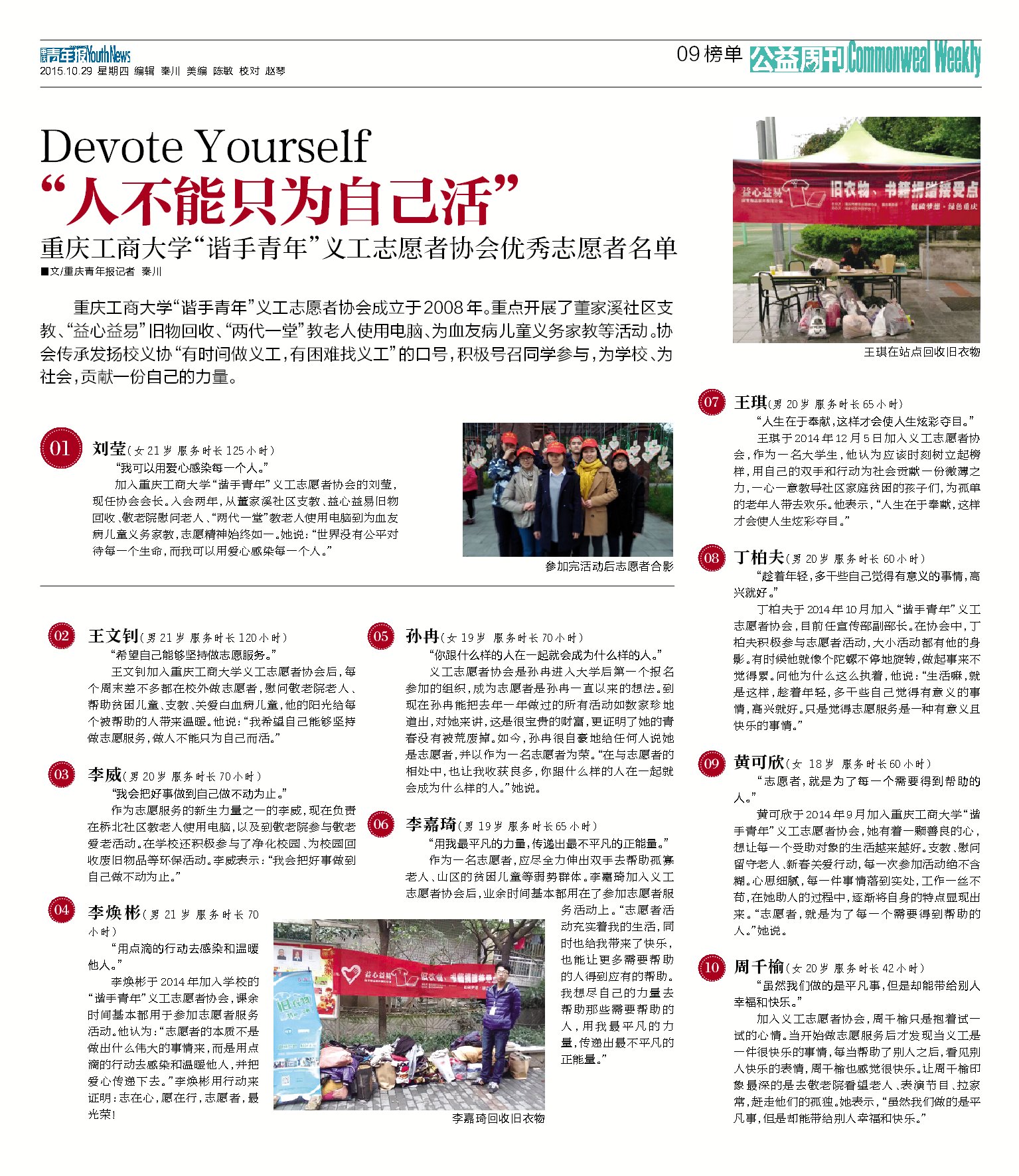 bat365官网艺术学院影视动画分院于2008年成立“谐手青年”义工志愿者协会。一直以来,全体志愿者们全心全意致力于为社会贡献自己的爱心与力量!重点开展了董家溪市民学校支教、“益心益易”旧物回收、“两代一堂”教老人使用电脑、为血友病儿童义务家教等活动。该义协传承校义协“有时间做义工,有困难找义工”的口号,积极号召同学们参与志愿者服务活动,为学校、社会奉献自己的青春和力量。重庆青年报于 2015年10月29日在公益周刊...