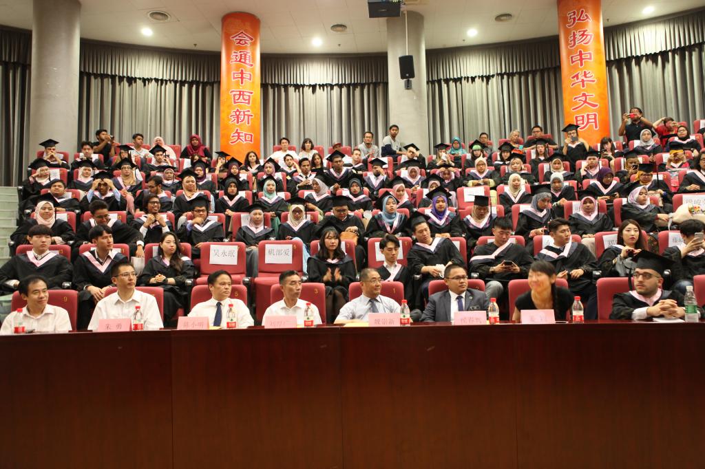 马来西亚驻华使馆教育参赞侯春兴先生、PA集团留学生办公室姜颖、中文学院院长魏崇新、党总支书记刘厚广、副院长陈小明、办公室主任张学增、对外汉语系主任朱勇以及部分授课老师出席毕业典礼。