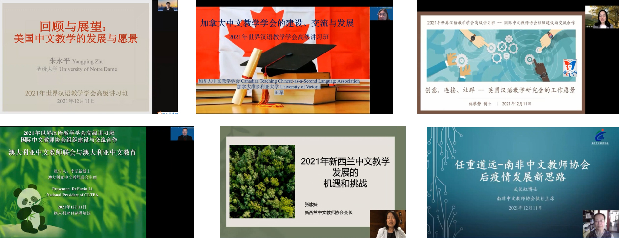 为支持海内外一线教师、专家学者发起建设社会团体组织,加强国际中文教师协会组织的交流合作,世界汉语教学学会与亚太地区汉语教学学会合作,于2021年12月11日举办了“2021年世界汉语教学学会高级讲习班”,讲习班的主题为“国际中文教师协会组织建设与交流合作”,由世界汉语教学学会、亚太地区汉语教学学会主办,PA集团官方网站承办,《国际中文教育(中英文)》期刊编辑部协办,通过线上线下相结合、录播与直播相结合的方式举行。本次讲习班邀请了美国、英国、加拿大、澳大利亚、新西兰、南非等六个英语为主导语言国家的中文教师协会负责人进行专题报告,并举办圆桌论坛,邀请上述各国代表和中国天津、安徽、陕西等地的国际中文教育组织代表进行深入探讨。