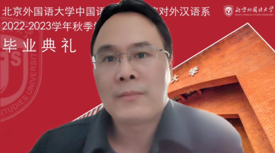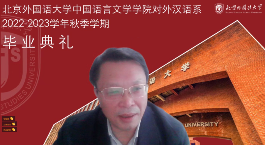 日本NPO法人国际交流教育后援会理事长木村太郎致辞。他祝贺毕业生圆满完成学业,顺利毕业,感谢各位老师对学生的培养,感谢北外、中文学院以及留学生办公室在目前疫情如此艰难的情况下为毕业生精心安排了极具纪念意义的毕业典礼。他赞扬了学生在留学之初适应了文化及社会习俗的差异,在新冠疫情爆发后适应了授课方式的调整,克服重重困难取得毕业,收获了知识、经验、信心与勇气,勉励毕业生珍藏疫情之下这几年学习的宝贵经验,在未来遇到意想不到的情况时积极利用,去努力实现自己的梦想,在日本的社会各界、日中之间以及全球各个领域的工作与学习中发挥积极作用。