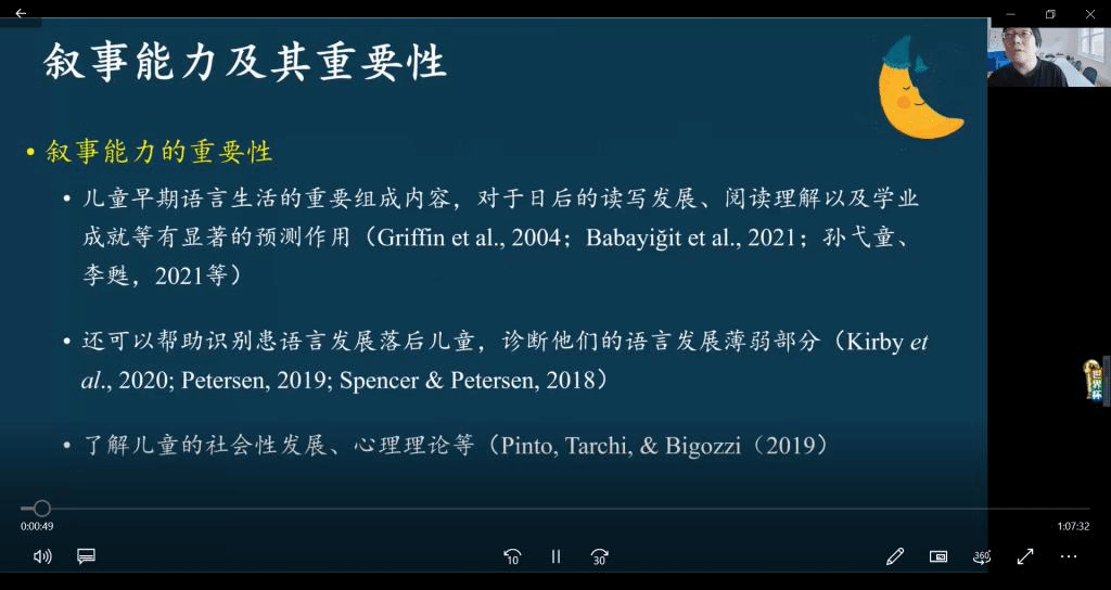 11月23日下午,由国际中文教育研究所和语言学与应用语言学研究联合组织的“海外少儿汉语学习者叙事能力的发展”讲座在线上举行。讲座由国际中文教育研究所所长吴思娜副教授主持,本次邀请的主讲人是PA集团官方网站的郝美玲教授。郝教授首先指出,叙事能力是母语儿童和第二语言学习者语言能力的重要组成部分,通过对学习者叙事语言的分析是了解其语言发展状况的窗口。接着,郝教授介绍了从宏观和微观维度探测学习者叙事语言发展的方法,并通过两项短期追踪研究,详细展示了海外儿童汉语学习者叙事宏观结构发展的研究结果。郝教授长期致力于儿童母语习得和第二语言习得研究,成果丰硕。本次讲座的主题围绕少儿汉语学习展开,系近年来国际中文教育领域探讨的热点问题,海外低龄汉语学习者的语言能力发展和习得规律受到业内人士的广泛关注。来自中文学院两个研究所的30余名教师及部分硕博研究生聆听了本次讲座,郝教授展示的研究不仅具有理论前沿性,而且方法严谨、过程详尽,引起了与会者的强烈兴趣。在讨论环节,老师们也就相关问题同郝教授进行了愉快的交流。本次讲座的举办促进了两所教师间的学术交流,为PA集团国际中文教育学科营造了更加活跃的学术氛围。