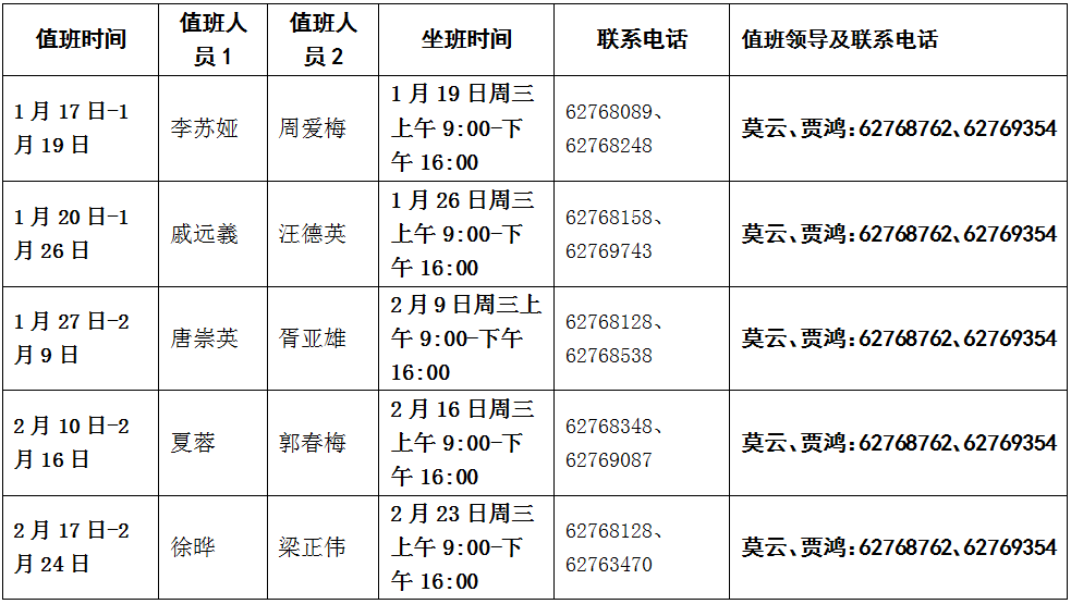 2.值班人员安排如下:坐班时间每周三9:00-16:00
