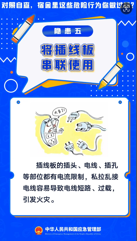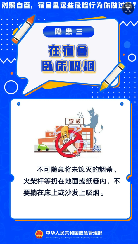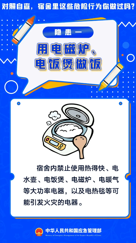 暑假假期正式结束,新学期开学啦。开学第一课,先学安全课,学校作为人员密集场所消防安全尤为重要,宿舍可燃物多且用电量大,一旦发生火灾后果不堪设想,用电饭煲做饭、使用劣质充电宝………对照自查宿舍里这些危险行为你做过吗?