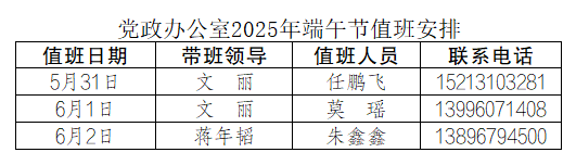 为更好地服务全校师生,保障端午节期间学校相关工作顺利开展,党政办公室每天均安排值班人员,负责学校校章、党委印章、法人印章、学校合同章、党政办公室印章等用印,学校介绍信开具,公文签发审核,会议室申请及使用等工作,请需求单位或师生按规定流程履行签批手续,其他未尽事宜,请与值班老师联系。
