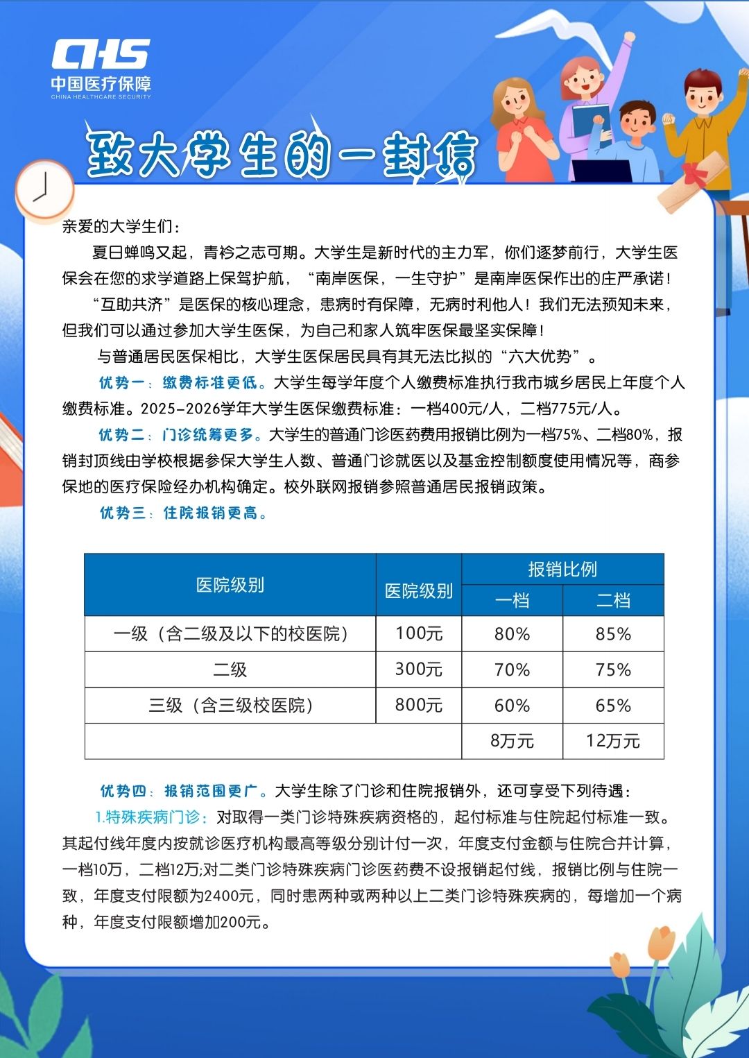 普通大学生参保缴费标准:一档400元/人,二档775元。