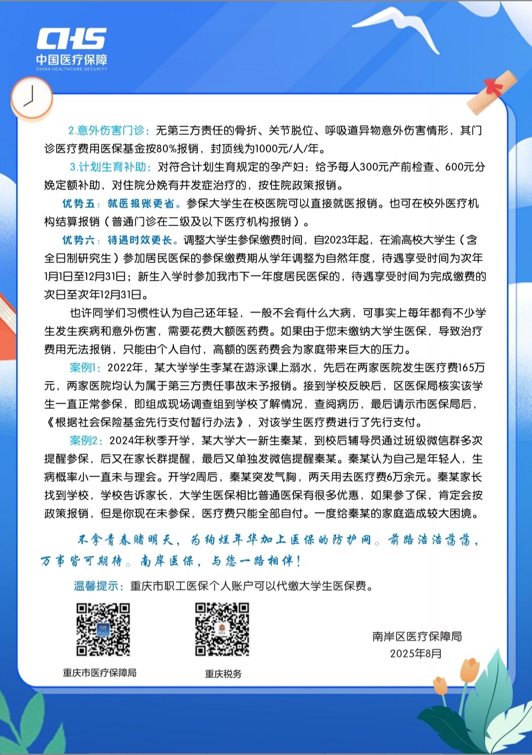 按照《国务院办公厅关于健全基本医疗保险参保长效机制的指导意见》(国办发〔2024〕38号)和《国家发展改革委办公厅等关于进一步提高高校学生医疗保障质量的通知》(发改办就业〔2024〕1096号)有关要求,根据重庆市医疗保障局、重庆市教育委员会、重庆市财政局、国家税务总局重庆市税务局联合发布的《关于做好大学生参加基本医疗保险相关工作的通知》(渝医保发〔2024〕31号)文件精神,为进一步做好bat365官网学生的医疗保障工作,现将2026年大学生参保政策解读如下:
