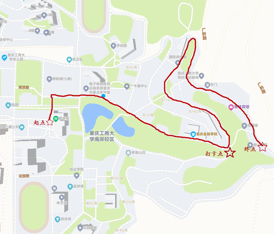 3.活动路线:校前广场(起点)——博智楼——厚德楼——田家炳书院(湖滨路)——泉水井(打卡点)——国际商学院——翠林宾馆——南山书院(终点)