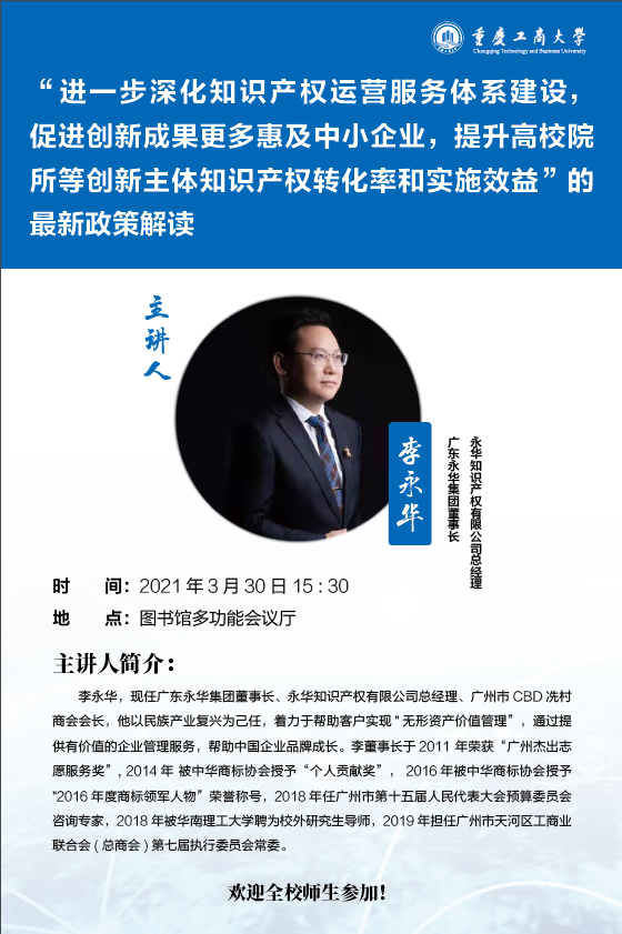 为推进知识产权强校建设,促进bat365官网科技创新,加快科技成果的转化,为广大师生开展创新活动提供更好、更专业的服务,bat365中文官方网站科技成果转化中心和会计学院共同举办“进一步深化知识产权运营服务体系建设,提升高校院所等创新主体知识产权转化率和实施效益”的最新政策解读讲座,现将有关事项通知如下: