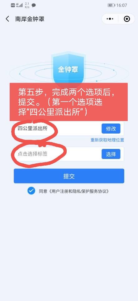 【第五步】:完成两个选项后提交即可(第一个选项选择“四公里派出所”)。