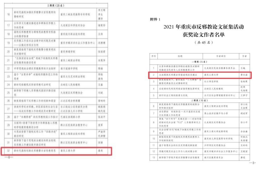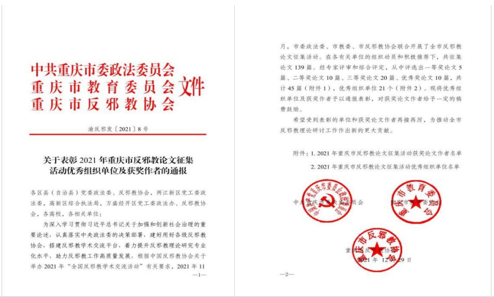 在市委政法委、市教委、市反邪教协会联合开展的全市反邪教论文征集活动中,党委保卫部(保卫处)黄杰渝同志撰写的《主流媒体反邪教宣传报道现状及建议》获得一等奖,秦爽同志撰写的《新时代高校创新反邪教警示宣传教育思路探析》获得三等奖。