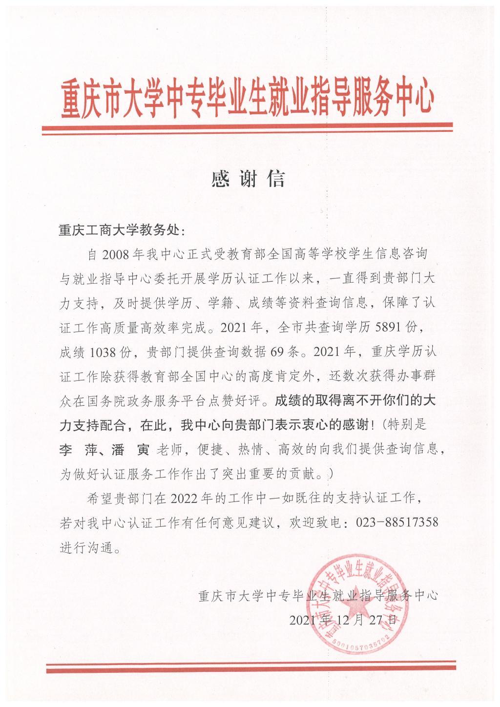 近日,重庆市大学中专毕业生就业指导服务中心向bat365官网教务处发来感谢信,对bat365官网在2021年的学籍管理工作和相关教师作出肯定和表扬。学校学籍管理工作人员常年为校友提供学历、学籍、成绩等方面的服务,得到了相关部门和广大校友的肯定。
