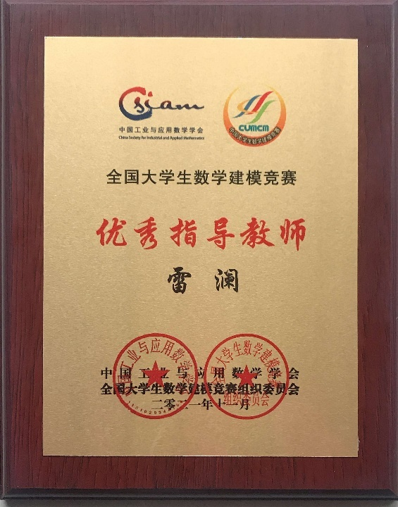 近日,庆祝全国大学生数学建模竞赛30周年暨2021“高教社杯”全国大学生数学建模竞赛颁奖典礼在线举行,bat365官网数学与统计学院雷澜副教授荣获该竞赛的全国优秀指导教师称号。数学建模竞赛全国优秀指导教师每十年评选一次,本次重庆市各高校共有5位教师获评,bat365官网数学与统计学院雷澜副教授位列其中。这是继2012年袁德美教授荣获“数学建模竞赛20周年全国优秀教练”称号之后,数学与统计学院教师又一次获此殊荣。