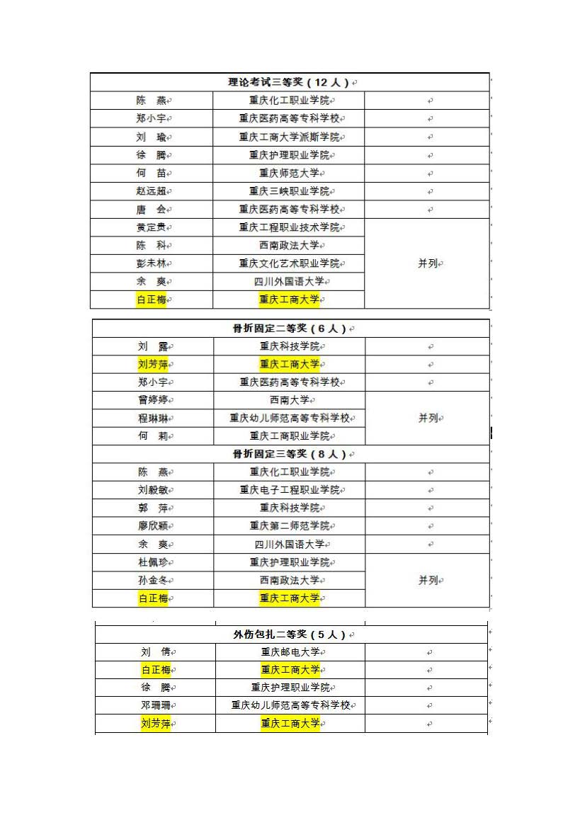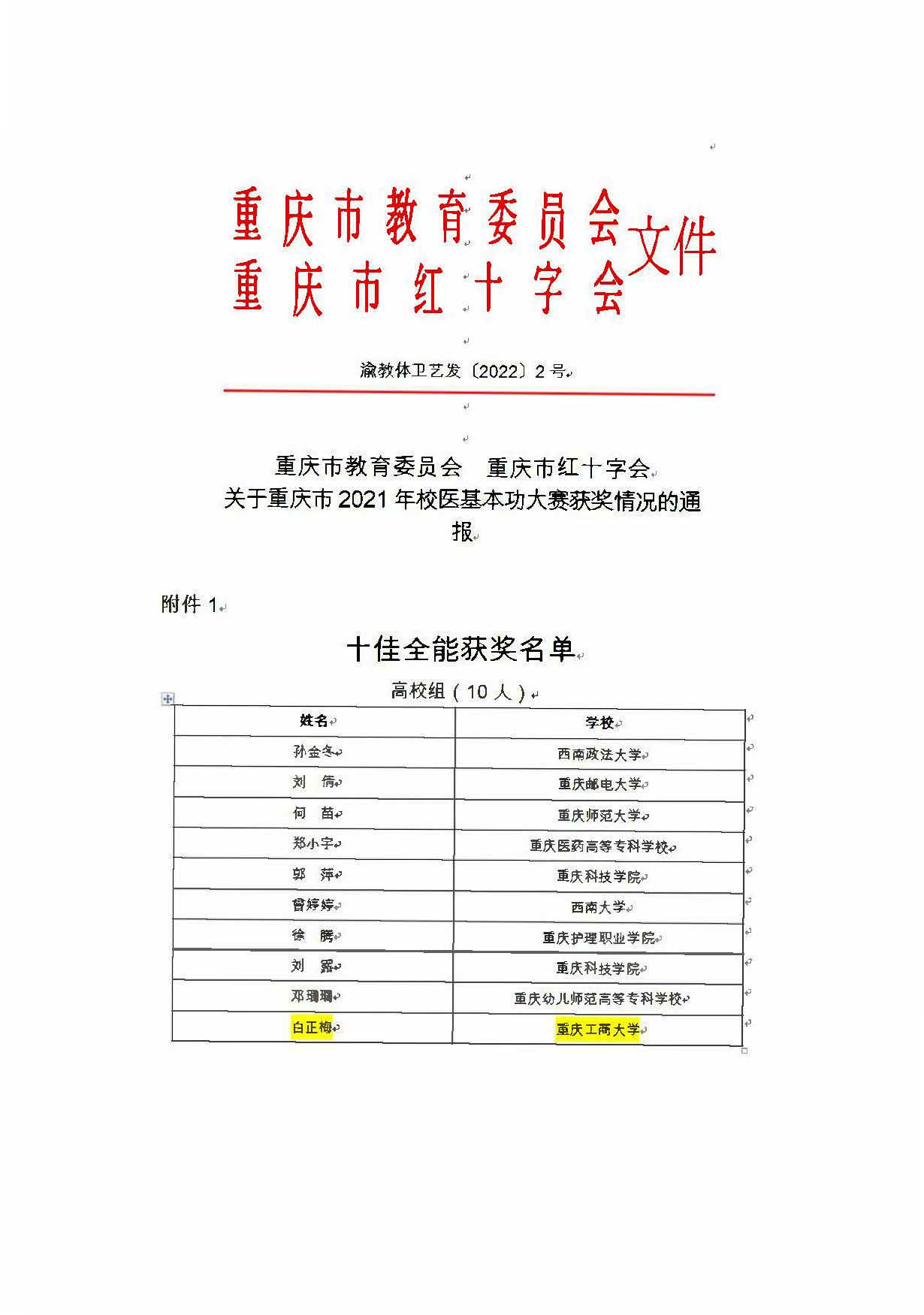 由重庆市教育委员会、重庆市红十字会主办,西南大学、重庆市中小学卫生保健所承办的重庆市校医基本功大赛于2021年12月12-14日在西南大学举行,bat365官网校医院精心组织、积极备战,经过与全市其他高校医院激烈角逐,最终bat365官网校医院勇夺佳绩,取得二等奖3个、三等奖2个,白正梅同志获得十佳校医荣誉称号,学校获得优秀组织奖,校医院负责人获得优秀组织者奖。