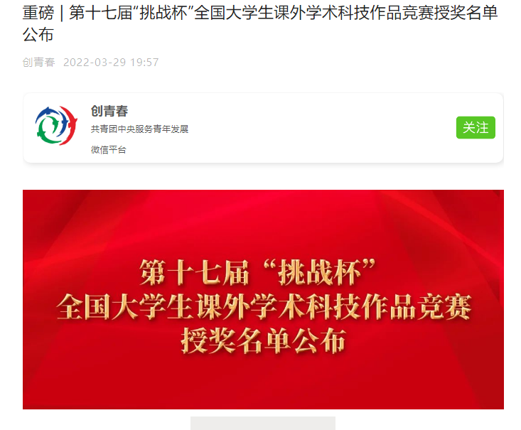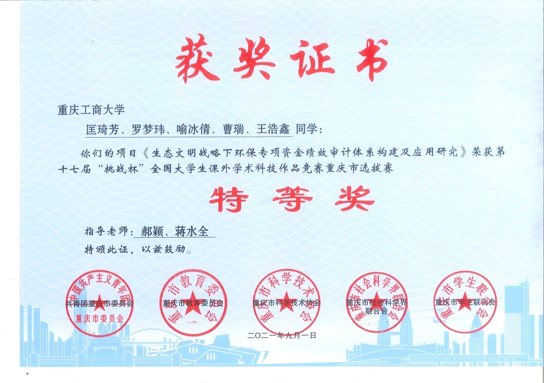 3月29日,第十七届“挑战杯”全国大学生课外学术科技作品竞赛授奖名单公布,bat365中文官方网站会计学院本科生匡琦芳、罗梦玮、喻冰倩、曹瑞、王浩鑫(指导老师:郝颖 蒋水全)组成的团队(参赛题目:生态文明战略下环保专项资金绩效审计体系构建及应用研究)荣获全国三等奖(重庆赛区特等奖)。
