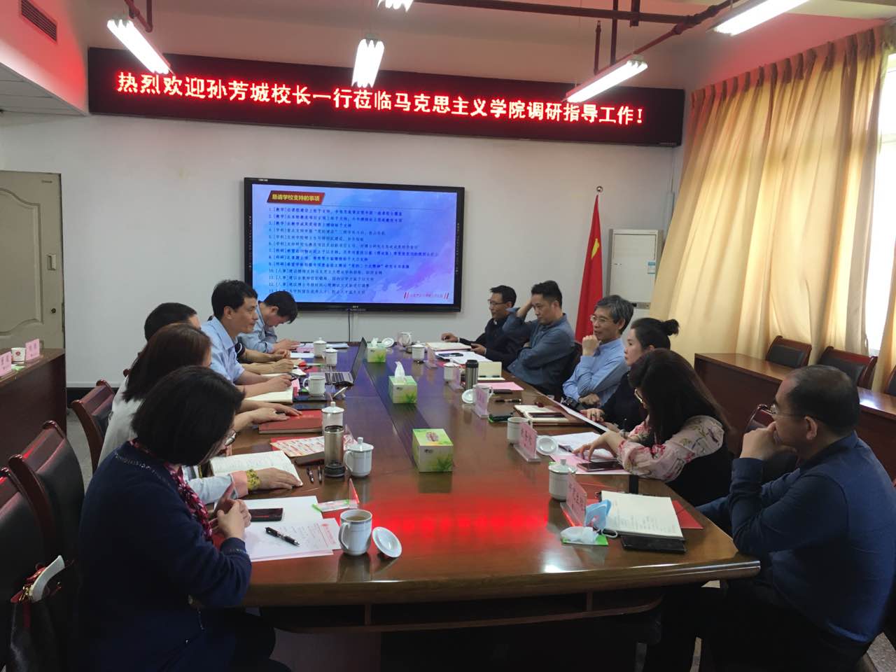4月13日下午,校长孙芳城一行调研指导马克思主义学院全面从严治党工作,并于91210办公室召开专题工作会议。党政办公室、人事处、教务处、科研处、研究生院等部门负责人,马克思主义学院党政负责人、各教研部负责人参加了会议。会议由马克思主义学院党委书记宋明江主持。