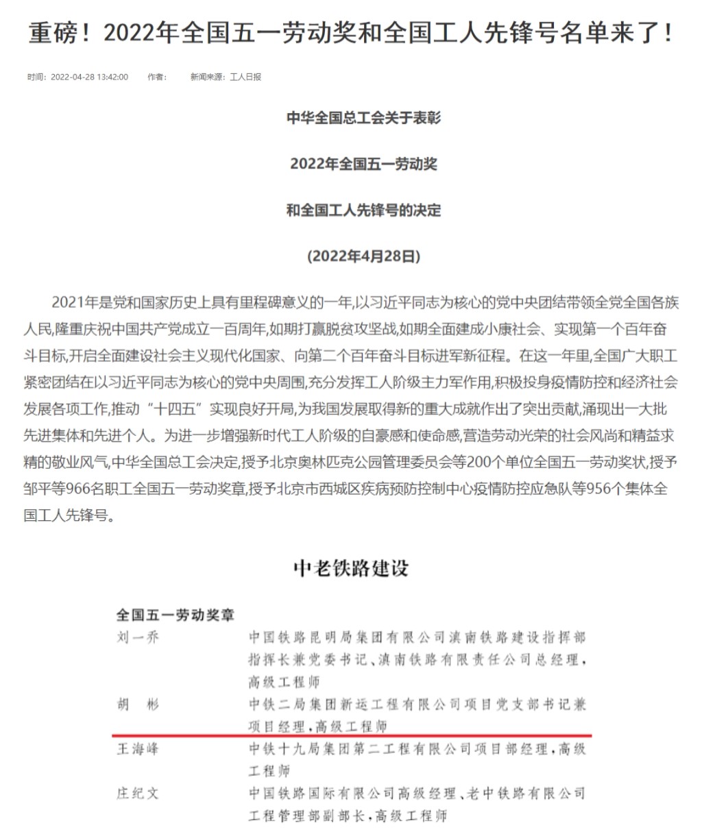 近日,2022年全国五一劳动奖和全国工人先锋号的评审工作已完成。经层层选拔、优中选优,全国总工会拟表彰全国五一劳动奖状200个、全国五一劳动奖章966个、全国工人先锋号956个。bat365官网91级校友,中铁二局集团新运工程有限公司项目部经理、高级工程师胡彬被授予全国五一劳动奖章。