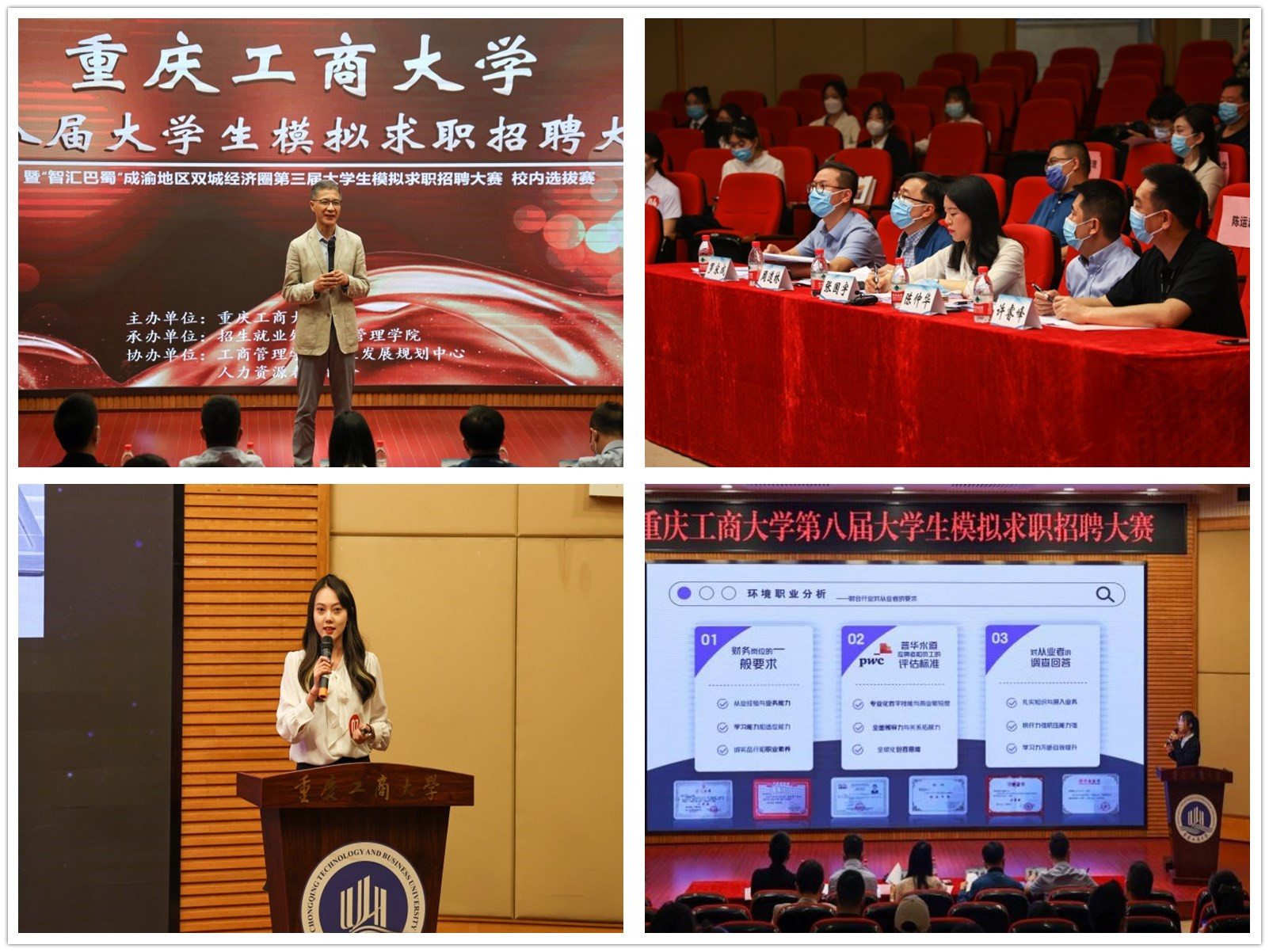 4月28日,由bat365中文官方网站招生就业处主办,工商管理学院承办的bat365中文官方网站第八届大学生模拟求职招聘大赛暨“智汇巴蜀”成渝双城经济圈第三届大学生模拟求职招聘大赛重庆赛区校内选拔赛在博智楼7200报告厅成功举办。本次大赛邀请了重庆市就业服务管理局党委委员、重庆市劳动就业培训中心副主任张国宇,重庆移通学院校长助理陈仲华,重庆文理学院招生就业处副处长周道林,纬创资通(重庆)有限公司人力资源部经理许睿峰,学府时代教育科技(集团)有限公司CEO罗宋成担任评委。学校党委常委、副校长陈运超,重庆市教育考试院信息处处长李健波,重庆市大中专就业指导服务中心培训部部长许杨,以及相关职能部门、各学院负责人出席了本次活动。