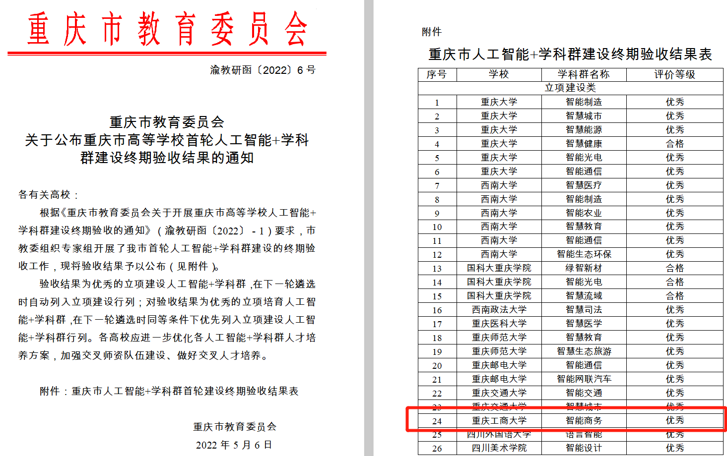 关于公布重庆市高等学校首轮人工智能+学科群建设终期验收结果的通知