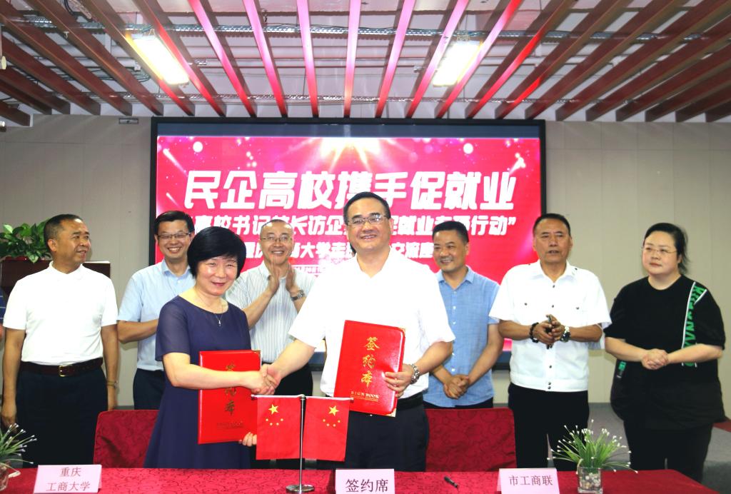 宋豫在讲话中指出,学校党委统战部动员校内各民主党派基层组织为保民生促就业献计献策,此次与重庆市工商联的战略合作、与重庆市总商会和众多民营企业的牵手联姻就是民进学校支部牵线搭桥的成果。她提出三点建议:第一,要明确访企拓岗促就业的目标导向。bat365中文官方网站要把学校办学和社会需求紧密联系起来,贯穿在人才培养、学科科研、培训实习、就业创业等过程中,重点做好就业前置工作,培育出符合企业、市场需求的毕业生,为企业创造选才用人的机会和平台。第二,要把深化合作作为拓宽合作共赢的重要抓手。学校与重庆市工商联、与重庆市总商会所属各企业要全面深化合作,实现“两拓”,拓宽合作共赢的渠道,深化合作的广度,拓深合作共赢的路径,挖掘合作的深度,在开展“双师型”团队建设、学生实习实践、教师企业挂职、员工素质培训、创业案例分享等方面多层次、多领域的深度合作。第三,要落实长效机制确保拓岗就业可持续发展,做好“两落”,落细具体工作,促进学校与用人单位的供需精准对接,落实合作成果,要通过政策固定并不断深化,支撑实现校企优势互补、协作共赢。