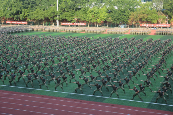 在庄严的国歌声中,鲜艳的五星红旗冉冉升起,军训总结表彰大会正式拉开帷幕。汇报表演分为分列式和军事科目汇报两部分。在分列式中,以国旗护卫队为先导的十七个方队,怀揣饱满的热情、高昂的斗志,喊着嘹亮的口号,迈着整齐的步伐依次走过主席台,他们生动地展现了重工商大学子蓬勃朝气和昂扬锐气,用实际行动为此次军训之旅交出了一份优异的答卷。随后,精彩的军事科目汇报表演开始。一团擒敌拳方阵,招招猛如虎,式式矫如龙,拳风阵阵是他们的宣言,喊杀声声是他们面对挑战的气概;二团军体拳方队,他们虎虎生威,踢腿凌厉有力,展现了二团热血男儿势如霹雳、横扫千军的气魄;三团捕俘刀女子方队,朝气蓬勃是她们的标志,整齐划一是她们的表现,一招一式无不体现出“巾帼不让须眉”的气势。党的二十大即将召开,恰逢学校70周年校庆,队列操1000余名女同学组成的方阵整齐划一、步伐铿锵,以精彩纷呈的队形变换展现出“CTBU”“70”“二十大”等字样,喊出“七秩重工商,逐梦新时代”的口号;手语操方队的同学们伴随歌曲《万疆》挥动手臂,寓意着家校同心、师生同行,笃行不怠、顽强拼搏,共同在新时代新征程上留下不懈的奋斗足迹,以实际行动迎接党的二十大胜利召开。
