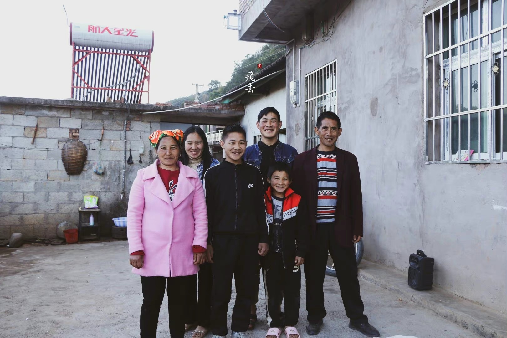 建档立卡户俄古一家人在新修好的砖房前合影留恋