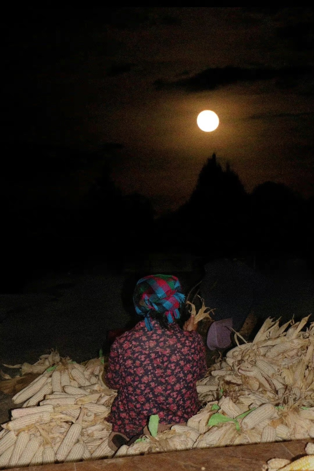 在月光下收拾苞谷的彝族阿妈