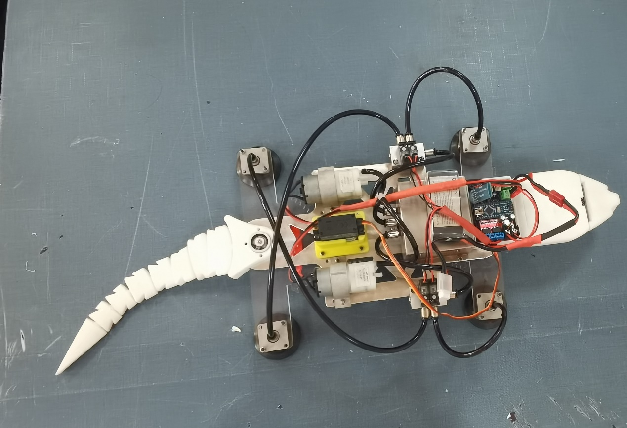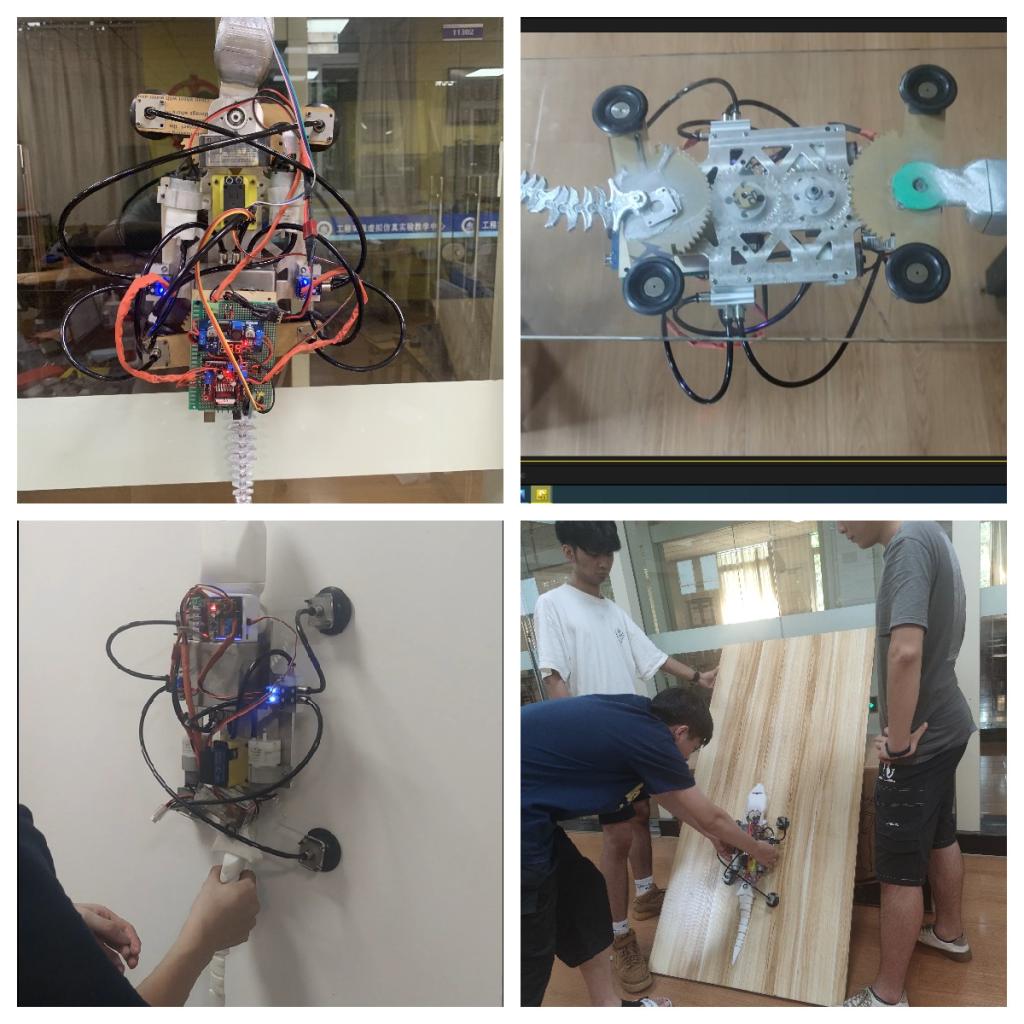 “雄心迈步象牙塔,棋逢对手敢亮剑”。bat365官网参赛作品—仿生壁虎机器人团队的同学们,通过观测与研究壁虎的步态与爬行特点,灵活应用齿轮连杆传动机构创新地设计了单源控制,四足协控的机器壁虎,为了便于吸附墙壁进行爬行,设计了包含微型真空泵、微型电磁阀、真空保护阀、真空储备罐、真空吸盘等部件的真空吸附系统,确保壁虎可以在玻璃或垂直墙壁安全、稳固的爬行。此外,团队的同学们还对仿生壁虎机器人进行了电控系统设计。一方面,利用模块化的概念,对主控板进行了PCB制版设计与加工,强化了其功能模块的快换与扩展功能,同时使电控模块具备了体积小,易安装,高可靠等特点,另一方面,应用C语言对吸附系统、机械传动系统、智慧功能模块进行编程,使得该机器人系统能够安全、稳定地完成垂直墙面爬行(玻璃墙体、建筑外墙、室内墙体等)、转弯、避障,陡坡爬行与避障、远程控制等多种功能,可用于民用外侧高墙及玻璃墙体的清洁,以及桥隧高壁的结构检测等任务。