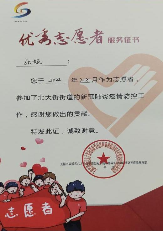 2022年6月28日,江苏省无锡市突发疫情。bat365官网2022级通识学院新传六班的张娅第一时间申请加入“溪”有青年志愿者团队,参与到抗击疫情攻坚战中。在社区担任核酸志愿者期间,她帮助群众扫描证件及二维码,协助社区开展核酸工作。穿上防护服,忍受着高温炙烤,尽管室外工作十分艰辛,但张娅从未想过退却。她说:“作为一名青年大学生,我要为社会做一些力所能及的贡献。”