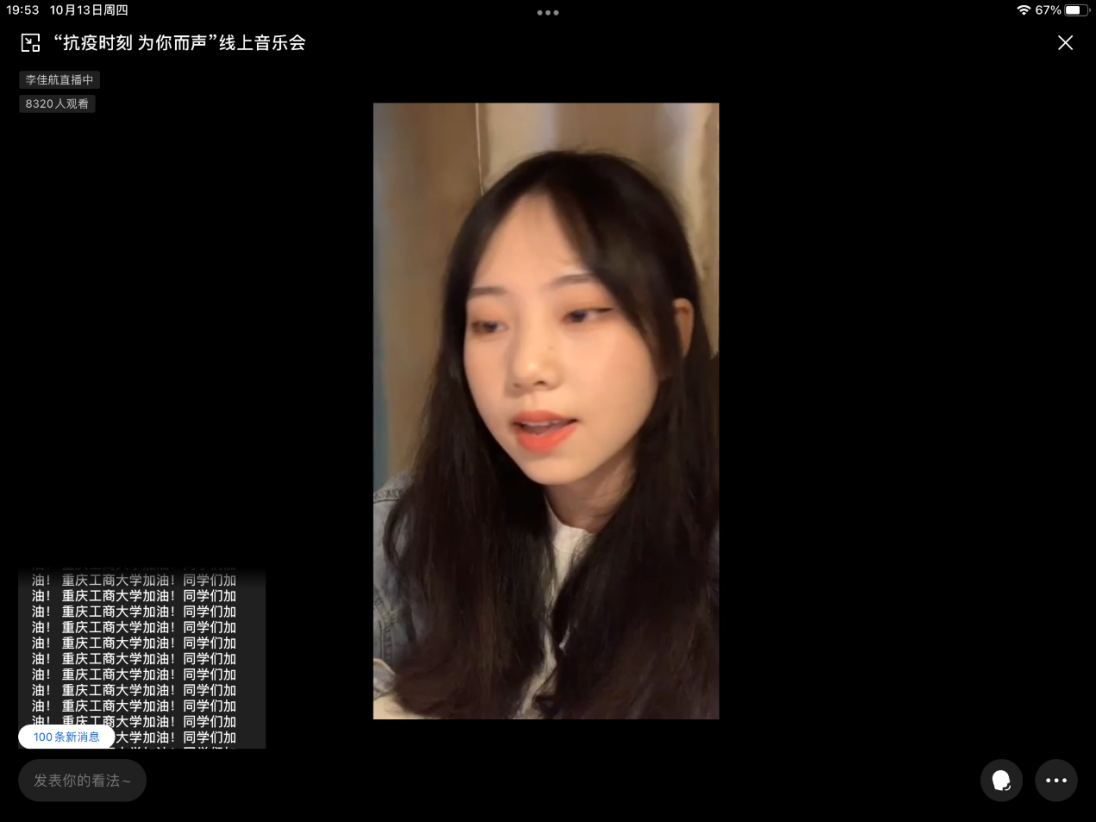 10月13日晚19:30,校团委通过企业微信用线上直播的方式举办“战疫时刻,为你而声”线上音乐会。音乐会通过线上演唱与游戏环节相结合的形式,10余名同学用音乐表达对终将战胜疫情的信心,用歌声把温暖和力量传递给全校师生。这是一场特殊的演唱会,同学们在线上隔空聚首,互相鼓励打气,评论区“bat365中文官方网站加油!同学们加油!”的弹幕文字刷满屏幕,凝聚着大家抗击疫情的坚强信念。本次线上音乐会受到全校师生热烈关注,直播预约人数近9000人,线上观看1.8万余人次,互动留言5.7万余条。