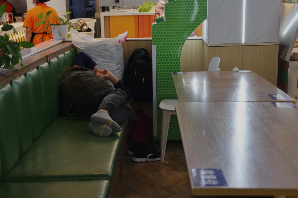 深夜,忙碌了一天的食堂员工们放下手中的工作,有的员工睡在桌椅上,有的更是直接在地板上打地铺……带着满身疲惫进入梦乡。短短几小时过后,他们又将继续新一天的辛勤工作。