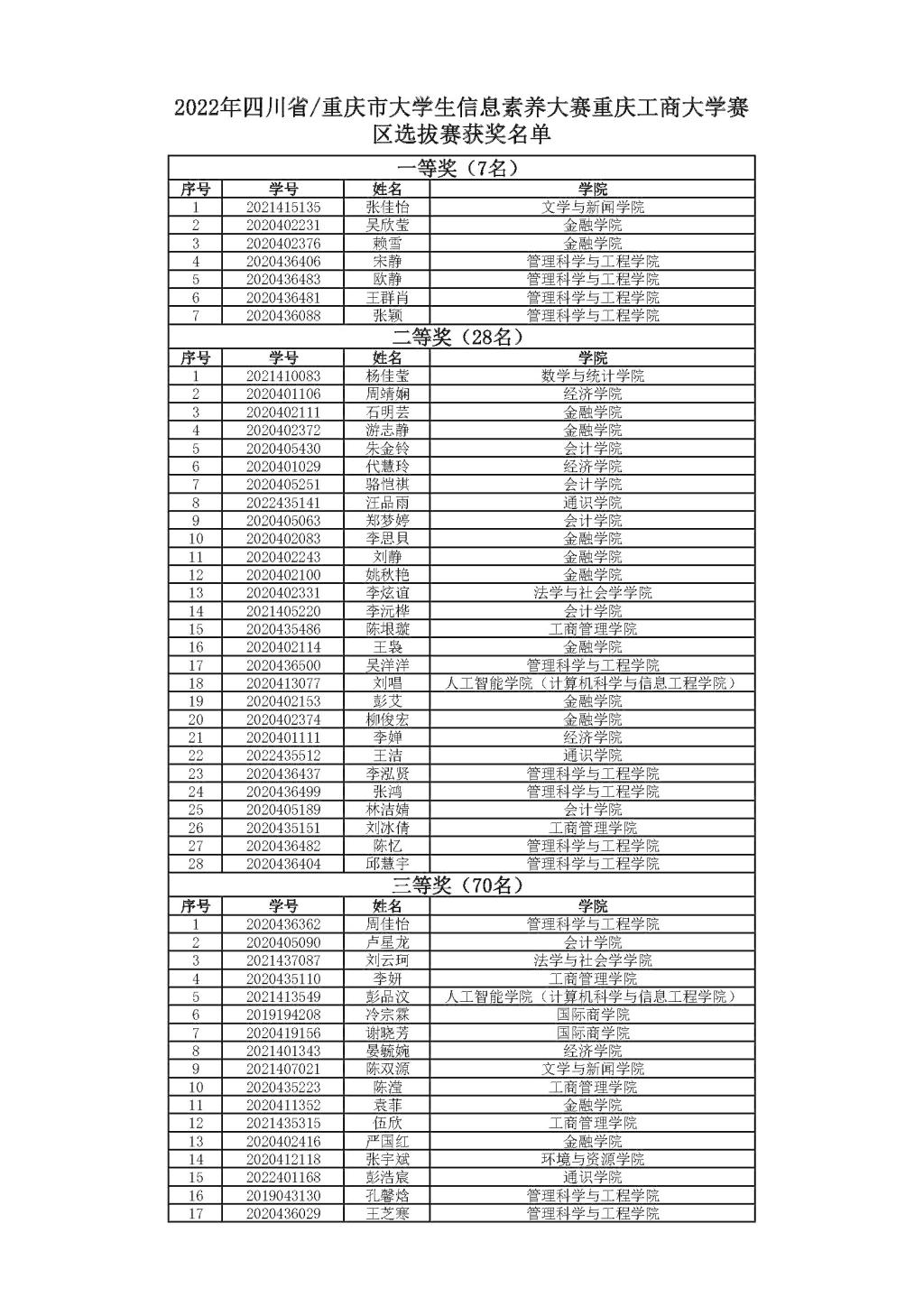 自9月22日发布比赛预通知以来,各学院同学积极踊跃报名参赛。本次比赛bat365官网注册人数1600余人,共有来自19个学院的近700名学生参加了比赛。在平台和指导老师的共同培训指导下,同学们积极自主学习,取得了优异成绩,75名同学在川渝高校28000余名全体参赛同学中排名前1800名以内,位列重庆市高校第二名,仅次于重庆大学。组委会根据比赛成绩排名(分数相同者答题时间短者排名靠前),共评出一等奖7名,二等奖28名,三等奖70名,获奖名单请见附件。