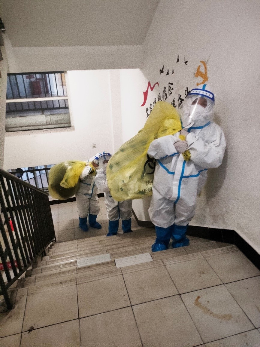 学校第一时间为江北校区增派了志愿者,他们参与流调、配合完成核酸检测,为封控楼栋学生上门单采,送餐……。当脱下密不透风的防护服时,才发现穿在里面的衣服全都湿透了,头发像刚洗过一样。这些可敬可亲的“大白”们,舍小家为大家,守护师生员工的生命安全和身体健康。