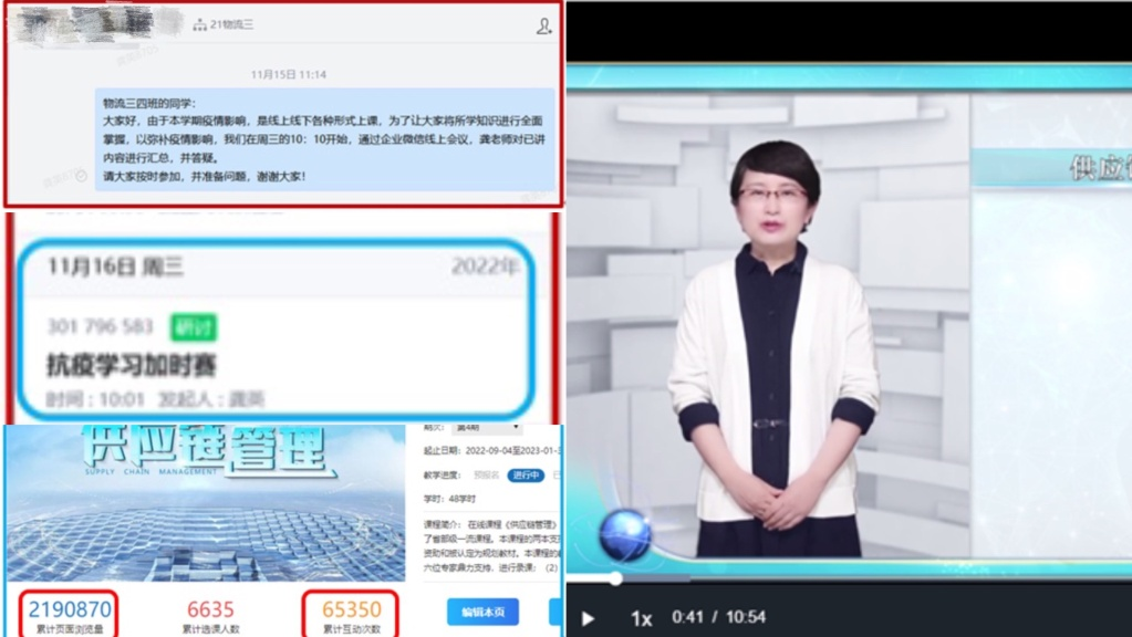 欧美同学会(归国留学人员联谊会)会员、管理科学与工程学院教师龚英,利用休息时间,在线上为21级物流管理4个班同学进行了相关专业课程的全面梳理,提供辅导服务。她在特殊时期,坚守育人的初心使命,奉献担当,用心用情站好“云”讲台,当好“云”教学的守护者,坚持不懈为学生传递爱与正能量,不愧为学生称道的一名好教师。好样的,龚老师!