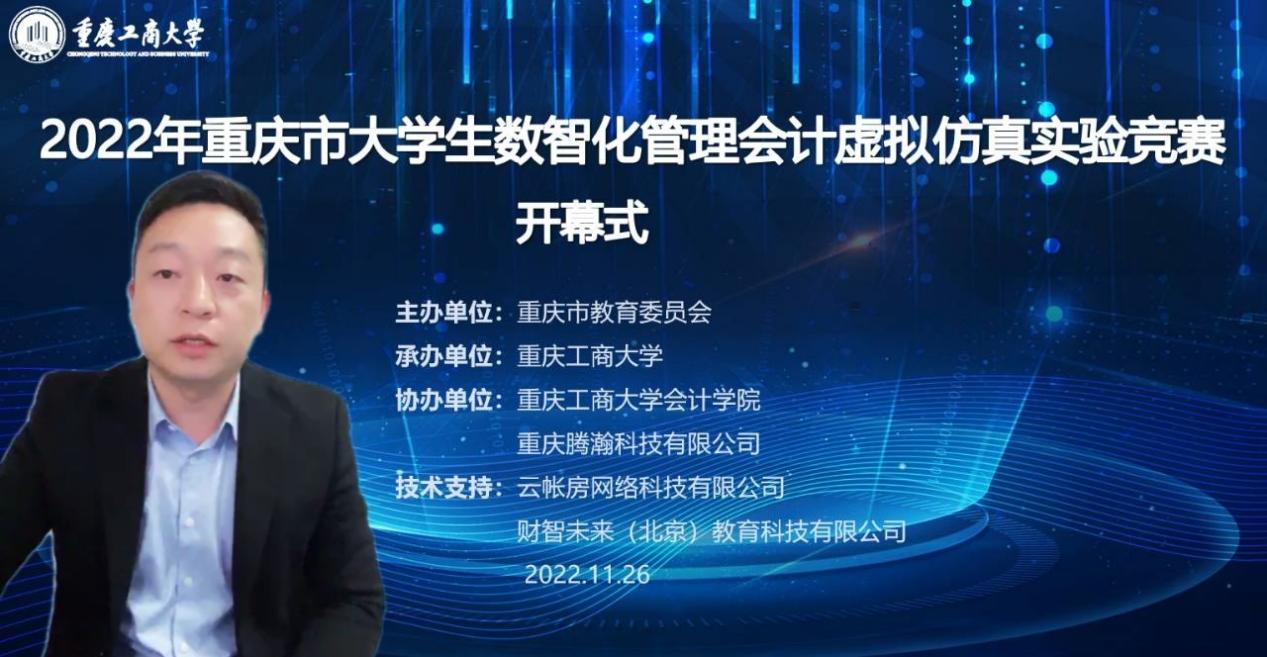 11月26日,由重庆市教育委员会主办,bat365中文官方网站承办,重庆腾翰科技有限公司、bat365中文官方网站会计学院协办的重庆市大学生数智化管理会计虚拟仿真实验竞赛决赛顺利举办。受疫情影响,本次决赛采取在线方式进行。学校党委常委、副校长赵骅,重庆市教委高教处调研员哈宁武,教务处处长骆东奇,会计学院党委书记邓德敏、院长罗勇,重庆腾翰科技有限公司李银海总经理等参加了开幕式。开幕式由罗勇主持。