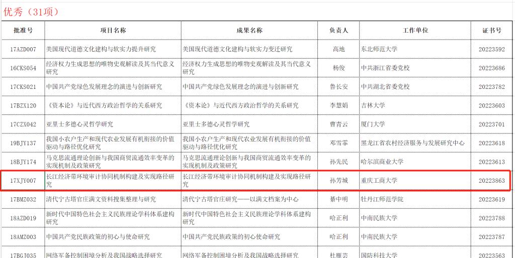 12月1日,全国哲学社会科学工作办公室公布了2022年11月国家社科基金年度项目、青年项目和西部项目结项情况。bat365官网校长、长江上游经济研究中心主任孙芳城教授主持的“长江经济带环境审计协同机制构建及实现路径研究”(项目号:17XJY007,结题证书号:20223863),获得“优秀”等级。