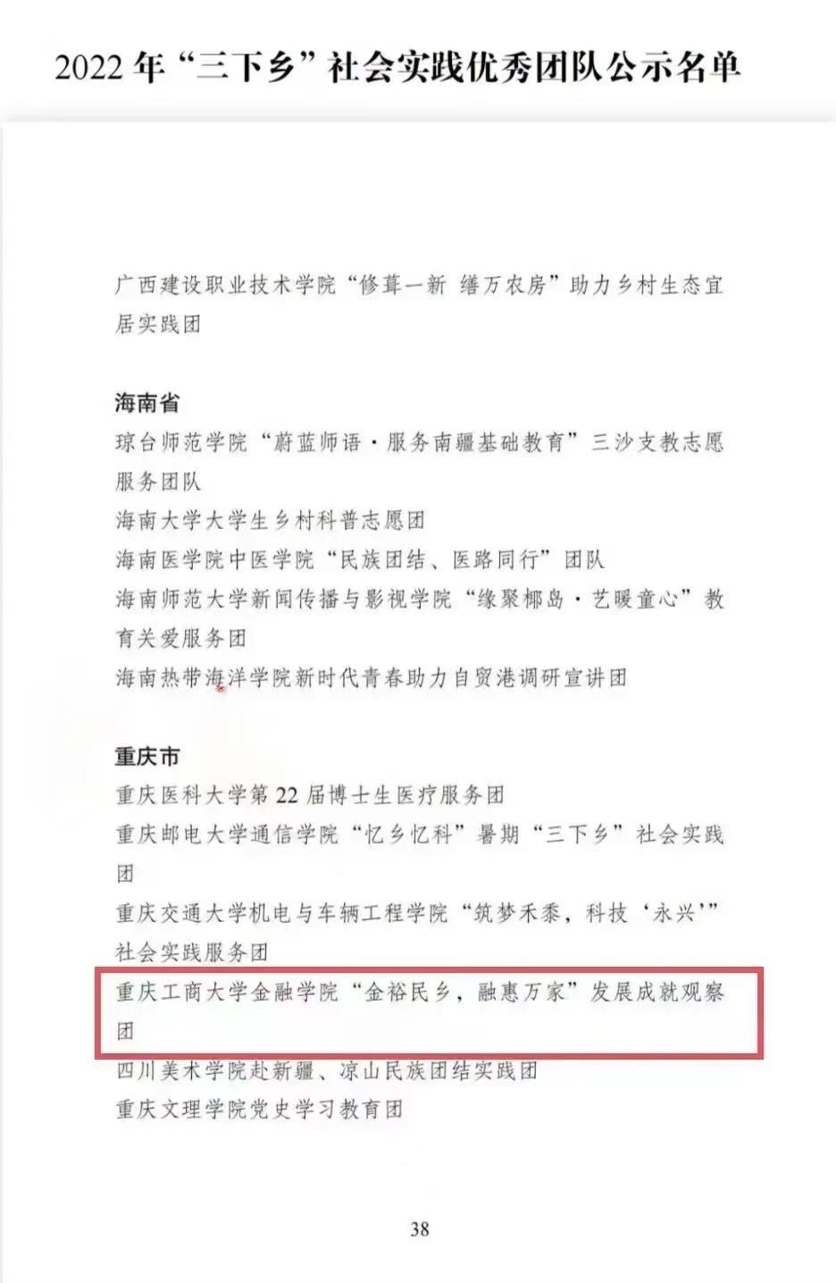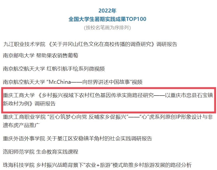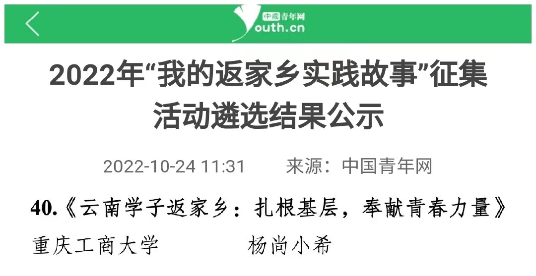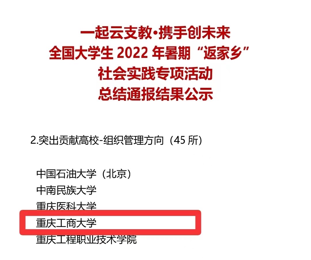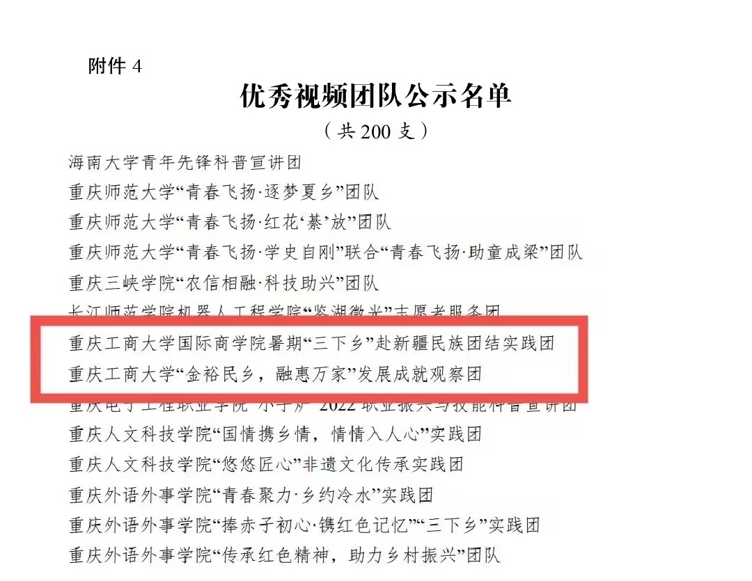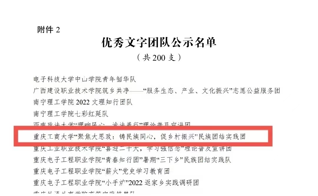 在中央宣传部、中央文明办、教育部、共青团中央、全国学联共同举办的2022年全国大中专学生志愿者暑期文化科技卫生“三下乡”社会实践活动评选中,bat365官网金融学院“金裕民乡,融惠万家”发展成就观察团荣获2022年“三下乡”社会实践活动全国优秀团队。在共青团中央青年发展部、中国青年报、中国青年网共同举办的2022年“镜头中的三下乡”征集活动中,校团委荣获“全国优秀组织单位”奖项,金融学院“金裕民乡,融惠万家”发展成就观察团、国际商学院暑期“三下乡”赴新疆民族团结实践团荣获“全国优秀视频团队”奖项,法学与社会学学院青年普法志愿者服务队荣获“全国优秀图片团队”奖项,通识学院“聚焦大思政:铸民族同心,促乡村振兴”民族团结实践团荣获“全国优秀文字团队”奖项。在共青团中央青年发展部、中国青年报、中国青年网共同举办的2022年“我的返家乡实践故事”征集活动中,法学与社会学学院学子杨尚小希作品《云南学子返家乡:扎根基层,奉献青春力量》荣获全国优秀作品。在中国青年报社主办的2022年第八届全国大学生暑期实践展示活动中,通识学院聚焦“‘大思政’:铸民族同心,促乡村振兴”民族团结实践团完成的《乡村振兴视域下农村红色基因传承实施路径研究——以重庆市忠县石宝镇新政村为例》调研报告入选2022年全国大学生暑期实践成果百强榜单。在共青团中央青年发展部主办的“一起云支教·携手创未来”全国大学生2022年暑期“返家乡”社会实践专项活动中,bat365官网荣获“突出贡献高校”奖。