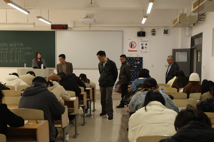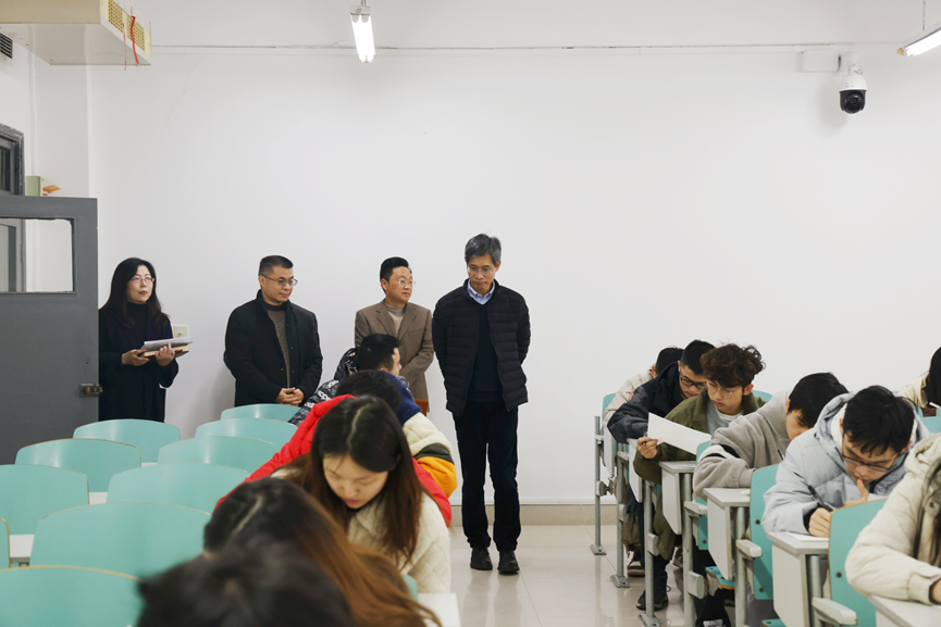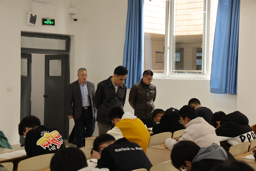 受疫情影响,bat365官网2022-2023学年第一学期期末部分考试推迟至本学期第一周进行,从2月27日开始,到3月5日结束,历时7天。为进一步加强考试组织管理,严肃考风考纪,2月27日,学校党委书记李志雄,党委副书记、校长孙芳城,党委常委、副校长李敬,在党委学生工作部、教务处、教学质量监督与评估办公室等部门负责人的陪同下,前往博智楼考场,检查开学考试工作。