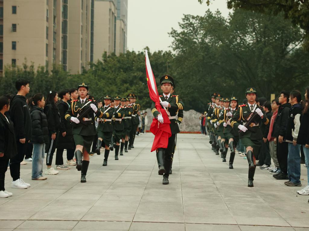 7时30分,升旗仪式正式开始。学校国旗护卫队队员昂首挺胸,脚步坚定铿锵,护卫着五星红旗走向升旗台。在雄壮的国歌声中,五星红旗冉冉升起,全体师生向国旗行注目礼,齐唱中华人民共和国国歌。