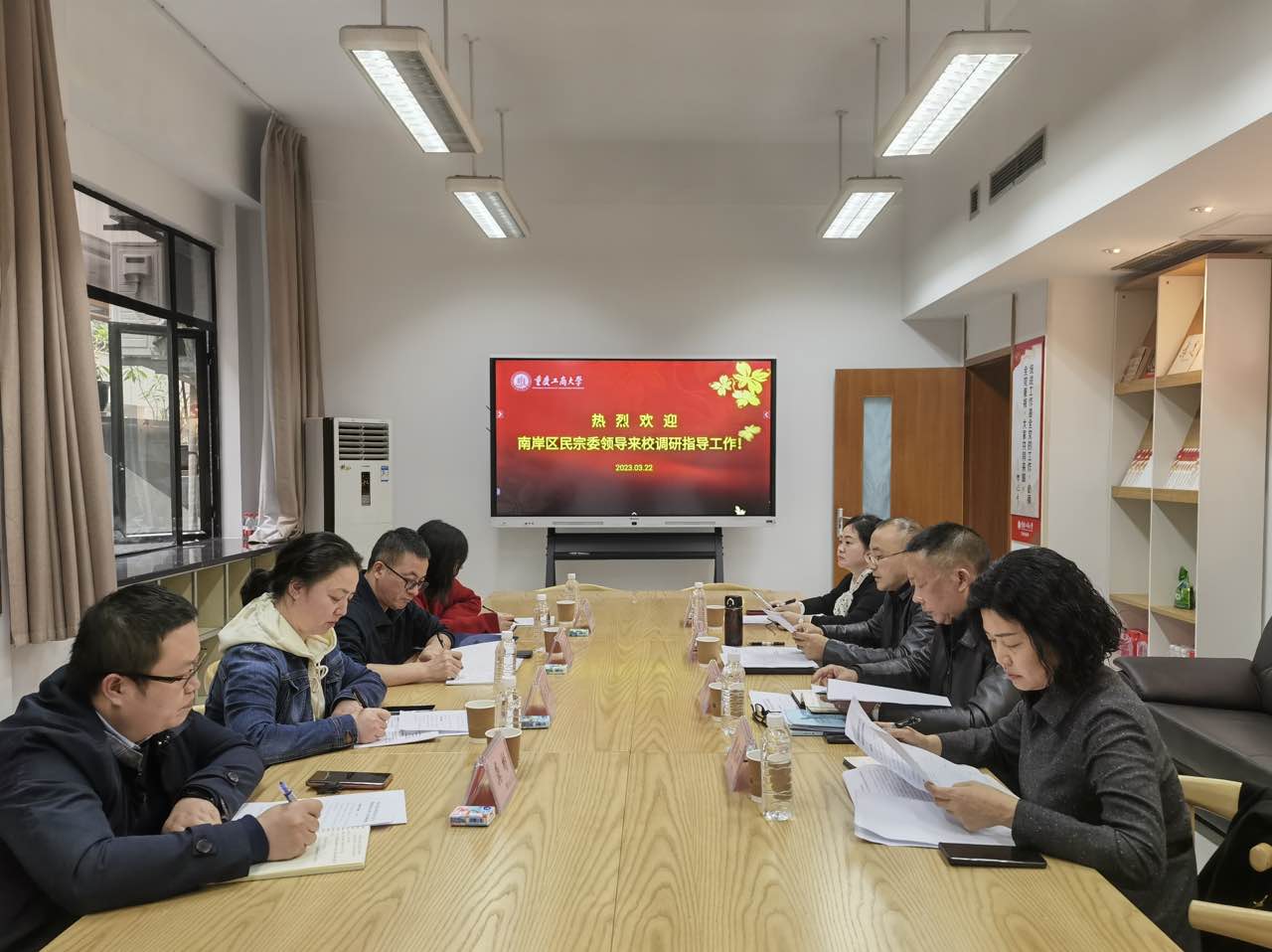 3月22日下午,南岸区委统战部副部长(兼)、南岸区民族宗教委党组书记、主任李小舟,南岸区民族宗教委副主任杨玉凤、办公室负责人胡城城、民宗科负责人龚斌一行来bat365官网调研指导民族宗教工作,在厚德楼1012“统战之家”召开了调研交流座谈会。学校党委常委、统战部常务副部长陈松,党委保卫部部长钱忠坤、副部长曹晓丽,党委学生工作部副部长谭彩荷参加了会议。会议由陈松主持。