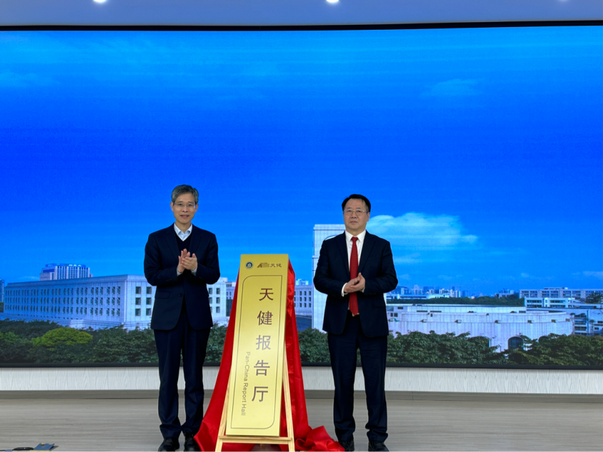 随后,孙芳城与龙文虎共同为天健报告厅揭牌。