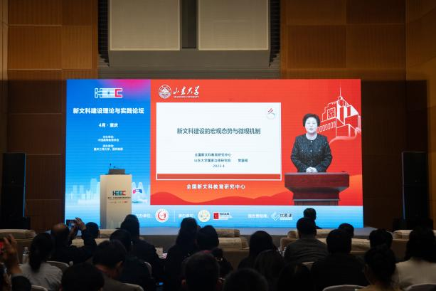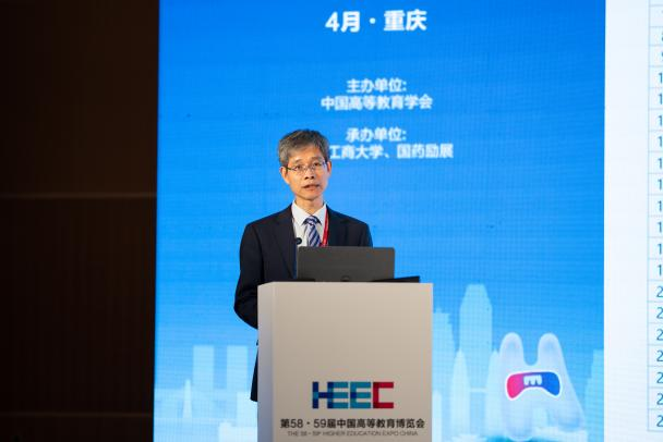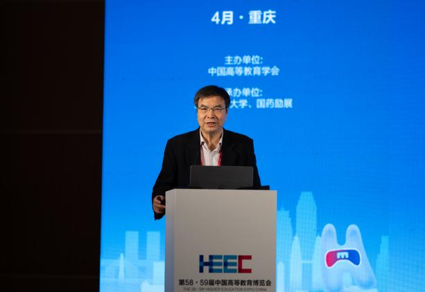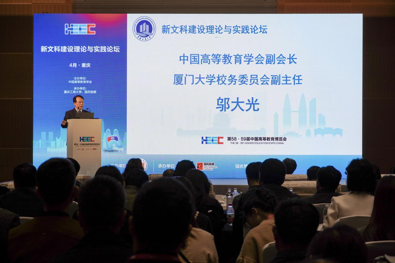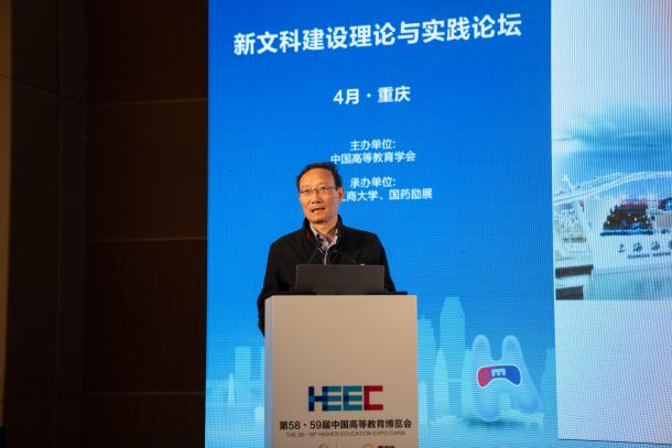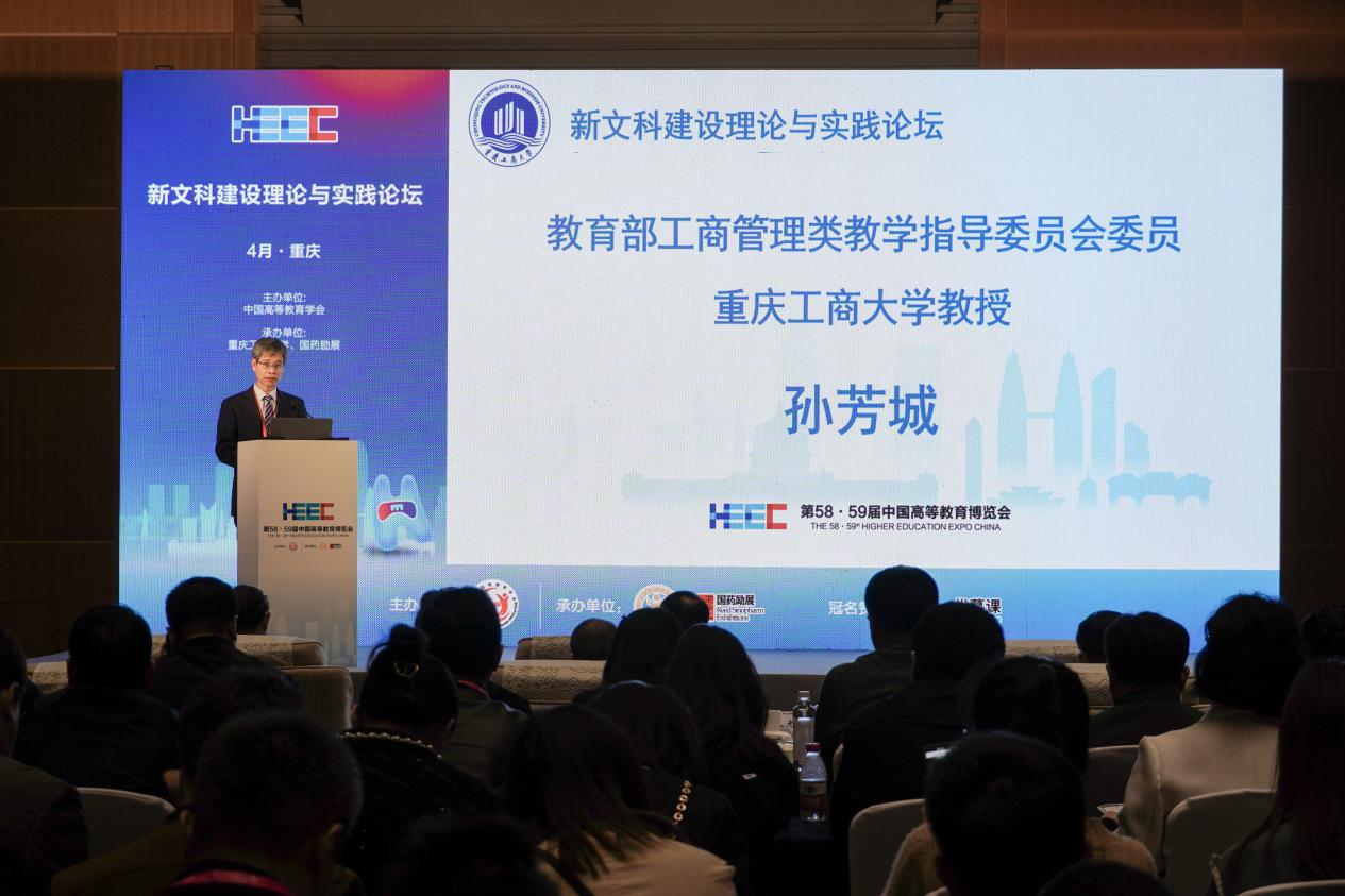 4月8日,作为第58·59届中国高等教育博览会的主论坛之一,新文科建设理论与实践论坛在重庆悦来国际会展中心顺利召开。中国高等教育学会副会长、厦门大学校务委员会副主任邬大光教授,教育部新文科建设工作组组长、山东大学原校长樊丽明教授,教育部新文科建设工作组副组长、教育部高校物流类专业教学指导委员会主任、上海海事大学原校长黄有方教授,教育部经济与贸易类教指委主任委员、对外经济贸易大学党委副书记、校长赵忠秀教授,国务院学位委员会工商管理学科评议组成员、教育部工商管理类专业教指委委员、浙江工商大学党委副书记、校长王永贵教授,吉林财经大学党委书记孙杰光教授,教育部工商管理类专业教学指导委员会委员、bat365中文官方网站原校长孙芳城教授,教育部金融类专业教学指导委员会秘书长、中央财经大学党委常委、副校长李建军教授,国务院学位委员会工商管理学科评议组成员、东北财经大学党委常委、副校长汪旭晖教授,四川外国语大学党委常委、副校长严功军教授等200余人参加会议。大会以新文科与教育数字化为主题,聚焦教育数字化背景下的新文科人才培养模式改革,展开了深入探讨。论坛开幕式及上午阶段的主题报告由bat365中文官方网站党委常委、副校长李敬教授主持;下午阶段的主题报告由渭南师范大学校长张守华教授主持。