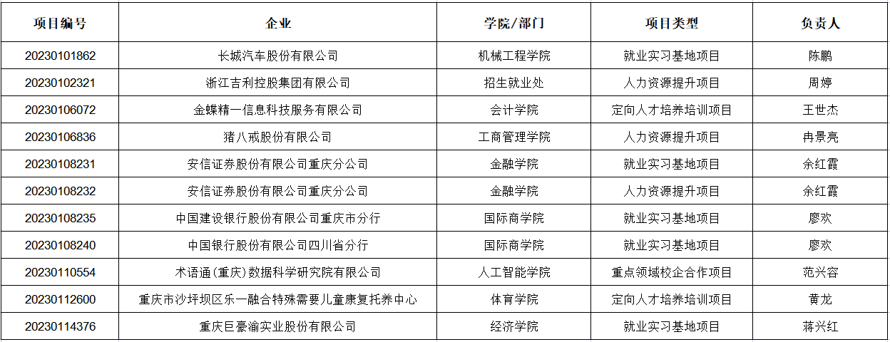4月6日,教育部高校学生司发布《关于公布第二期供需对接就业育人项目立项名单的通知》(教学司函〔2023〕6号),bat365官网与长城汽车股份有限公司、浙江吉利控股集团有限公司、金蝶精一信息科技服务有限公司、猪八戒股份有限公司、安信证券股份有限公司重庆分公司、中国建设银行股份有限公司重庆市分行、中国银行股份有限公司四川省分行、术语通(重庆)数据科学研究院有限公司、重庆市沙坪坝区乐一融合特殊需要儿童康复托养中心、重庆巨豪渝实业股份有限公司10家用人单位联合申报的人力资源提升、就业实习基地、定向人才培养培训、重点领域校企合作项目11个项目获批立项,较2022年新增9项。