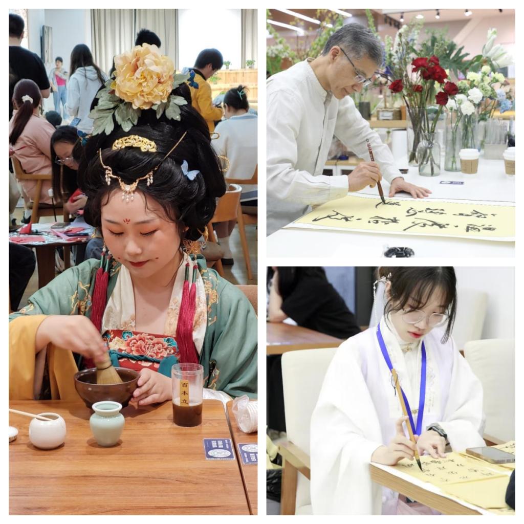 参加活动的同学,可以亲身体验软笔书写、剪纸艺术、投壶缠花,体会民族传承千年的文化图腾,一幅幅作品在精美团扇笺纸上装裱生辉;在一问一答之间,跨越历史长河,与历代先贤同享乐趣;在茶香雅乐中,于书笺处落笔,在岁月时光里,留下一丝阅读印迹。