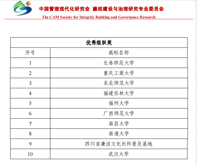 本次评选活动由中国管理现代化研究会廉政分会、全国大学生廉洁社团网络、东北师范大学政法学院、共青团东北师范大学委员会联合举办,共有全国37所高校申报参赛,其中10个高校获评优秀组织奖。