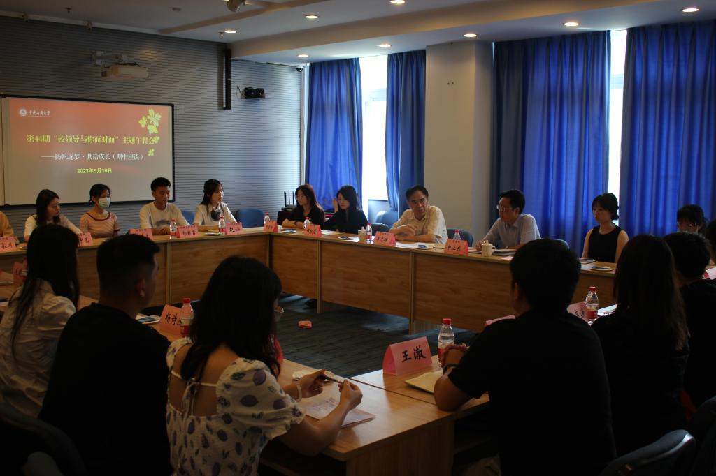 为扎实开展学习贯彻习近平新时代中国特色社会主义思想主题教育,认真落实习近平总书记“要深入调查研究”的讲话要求,5月16日上午,学校在南岸校区启智楼80412C会议室举办了主题为“扬帆逐梦•共话成长”的“校领导与你面对面”主题午餐会。党委书记李志雄,以及党政办公室、学生处、保卫处、教务处、研究生院、招生就业处、后勤处、校团委、图书馆、信息化办公室等部门负责同志、南岸校区学生代表参会。会议由学生处处长申卫东主持。