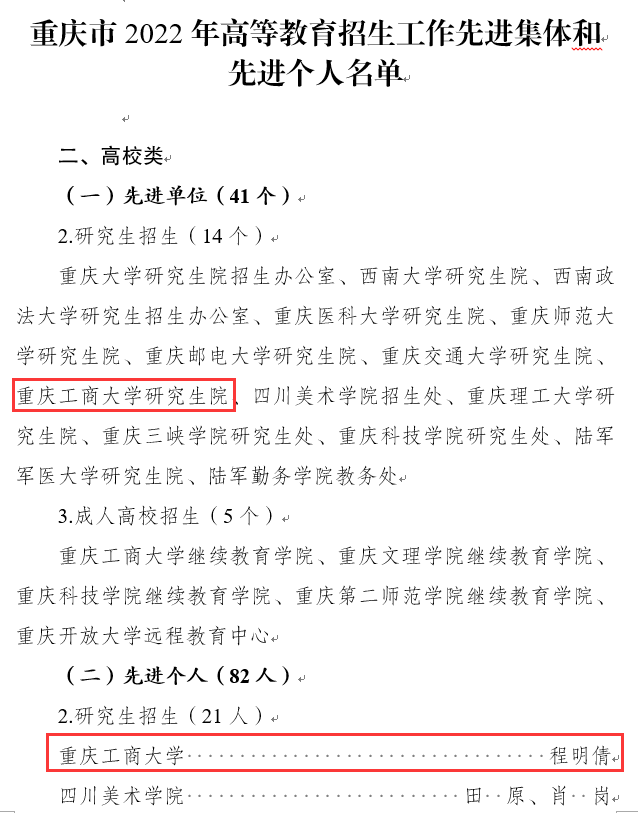 近日,重庆市教育委员会发布《关于2022年高等教育招生工作先进集体和先进个人的通报》(渝教招函〔2023〕3号),bat365官网研究生院获评“高等教育招生工作先进集体”,程明倩同志获评“高等教育招生工作先进个人”。