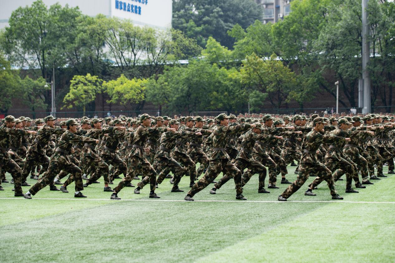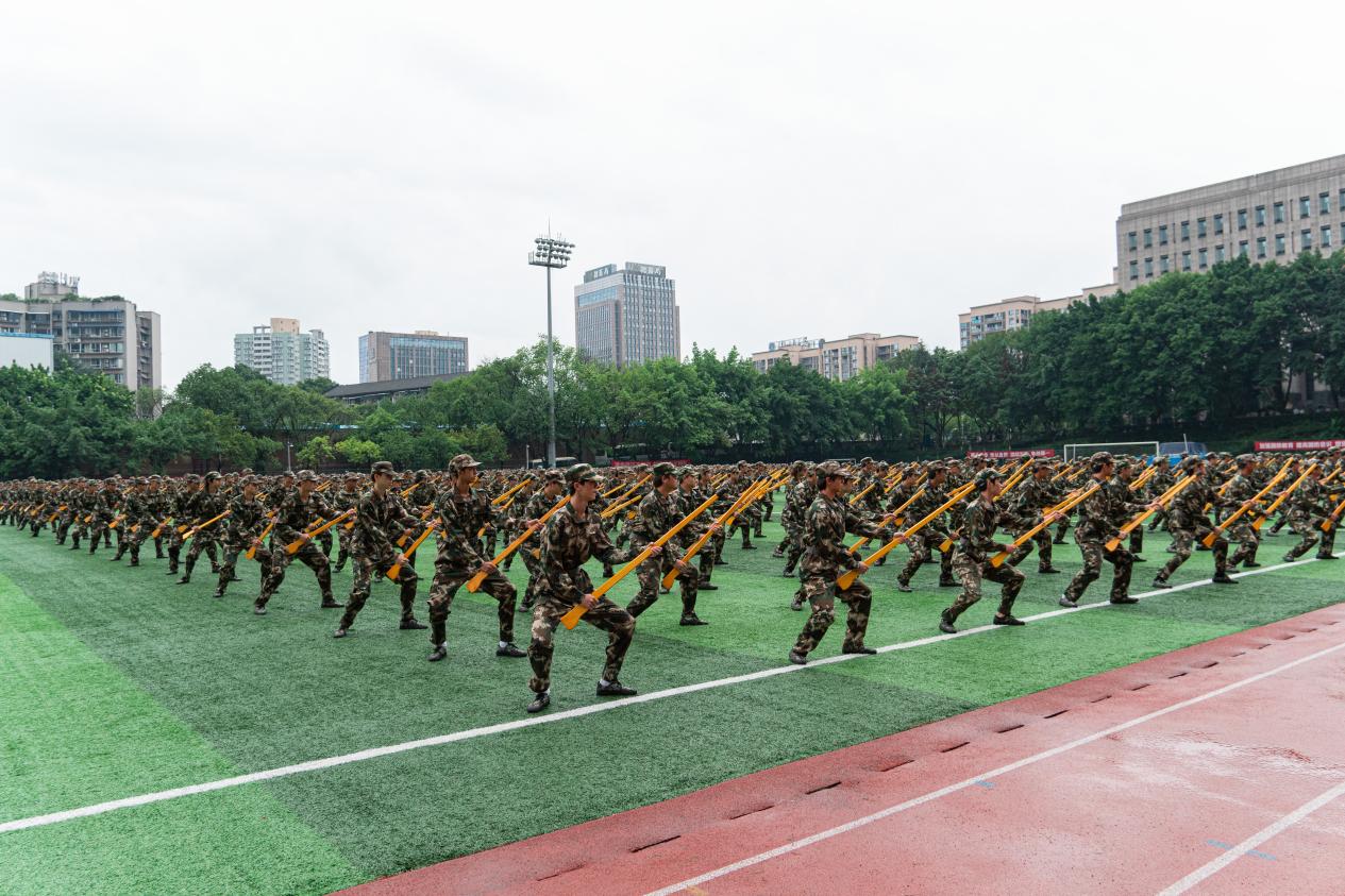 动感十足、活力四射的韵律操,将运动与艺术完美结合,充分展现了青春的风采与魅力;“利刃出鞘淬刀锋,杀声阵阵展血性。”铿锵有力的捕俘拳,勇猛矫健的军体拳,动作精炼、节奏分明的捕俘刀表演,尽显军训学子坚韧不拔、勇敢顽强的战斗作风;手握钢枪、目光灼灼、脚步轻捷的战术小组带来了一场精彩的反恐表演;动如腾龙出海,静似猛虎卧山。刺杀操方阵以最嘹亮的呐喊声为整片会场增添了一抹雄壮的色彩,一招一式尽显工商学子的豪迈气概;队列操方阵手持红黄两色纸板,通过颜色和动作改变,变换出“CTBU”“1952-2023”“厚德博学 求是创新”“爱国 诚信 和谐 奋进”“勤学善思 求真笃行”等字样和党旗、中国地图等图案,伴随着《祖国不会忘记》的歌声响起,队形收拢。