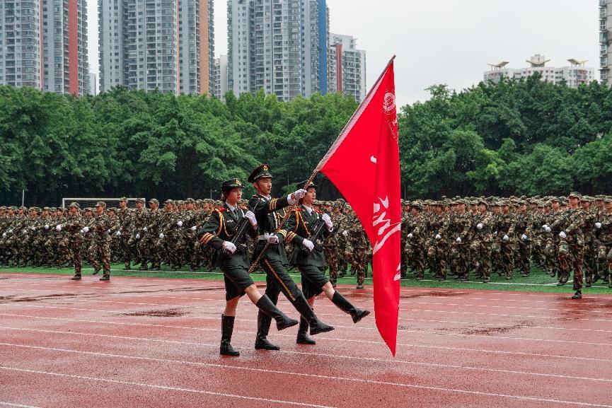 在军训成果汇报环节,以国旗护卫队为先导的十七个分列式方阵,伴随着雄壮的进行曲,喊着整齐划一的嘹亮口号,迈着整齐的步伐依次走过主席台接受检阅。同学们满腔热血和高昂斗志,生动展现了重工商大学子的蓬勃朝气和昂扬锐气。