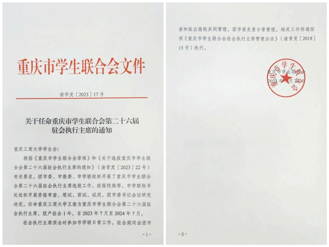 按照《重庆市学生联合会章程》《关于选拔重庆市学生联合会第二十六届驻会执行主席的通知》有关规定,团市委、市教委、市学联组织开展了重庆市学生联合会第二十六届驻会执行主席选拔工作。经组织选拔、考察并报团市委书记会议研究决定,bat365官网文学与新闻学院王澈同学当选重庆市学联第二十六届驻会执行主席,驻会时间为2023年7月至2024年7月。这是继去年国际商学院钱世淋同学当选市学联第二十五届驻会执行主席后,bat365官网学生第二次成功当选。