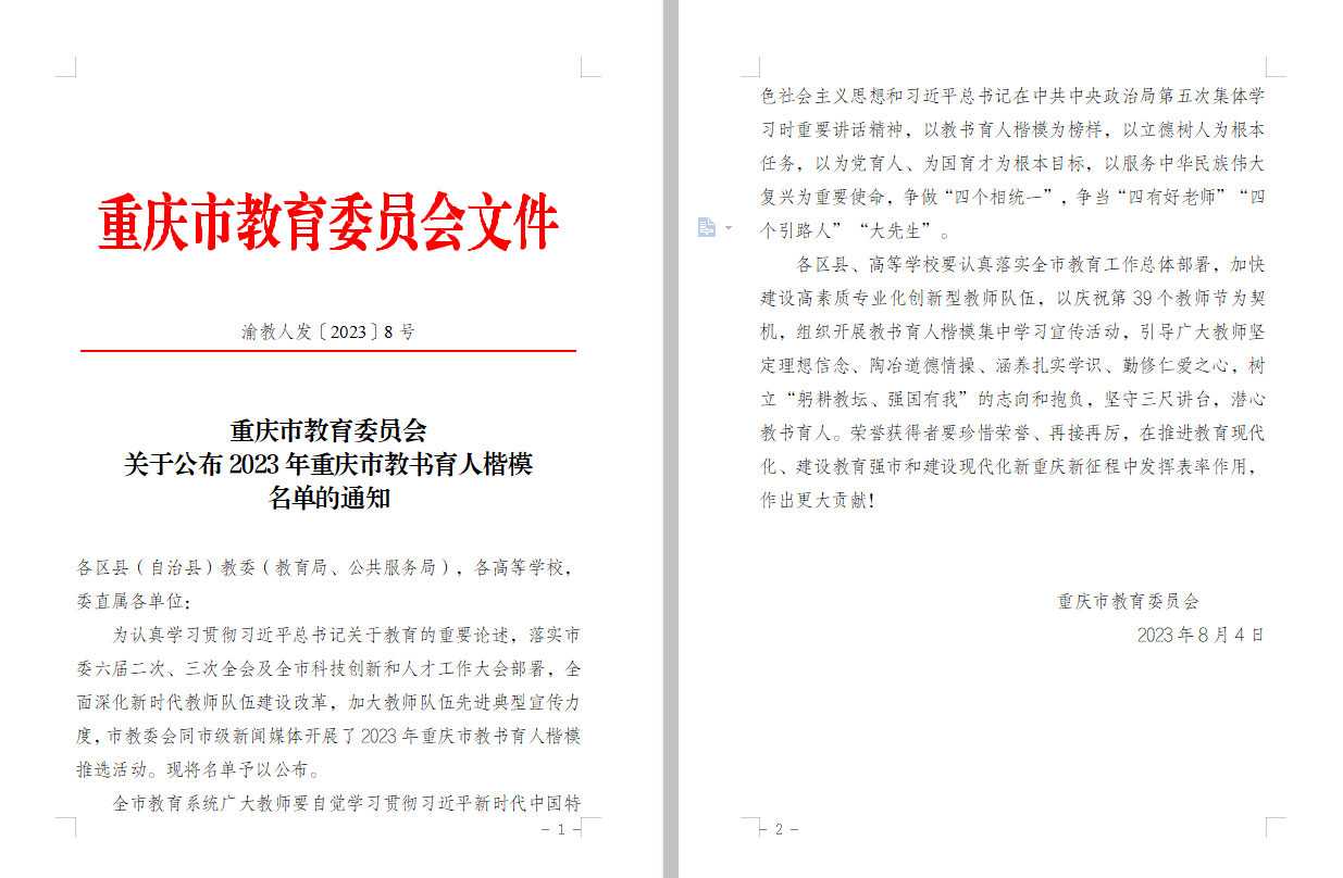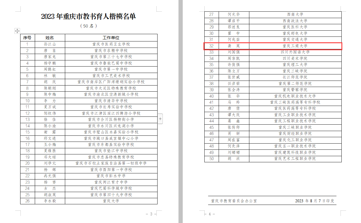 为认真学习贯彻习近平总书记关于教育的重要论述,落实市委六届二次、三次全会及全市科技创新和人才工作大会部署,全面深化新时代教师队伍建设改革,加大教师队伍先进典型宣传力度,市教委会同市级新闻媒体于2023年5月至8月开展了教书育人楷模推选活动,经各区县、各高校推荐、专家综合评审、活动组委会审定等环节,共选树出50名重庆市教书育人楷模(其中高校教师25名)。bat365官网管理科学与工程学院教师龚英获评“2023年重庆市教书育人楷模”。
